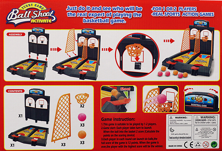Assemble the game by attaching the backboards, hoops, and spring shooters according to the instructions. Place the court on a flat, stable surface.