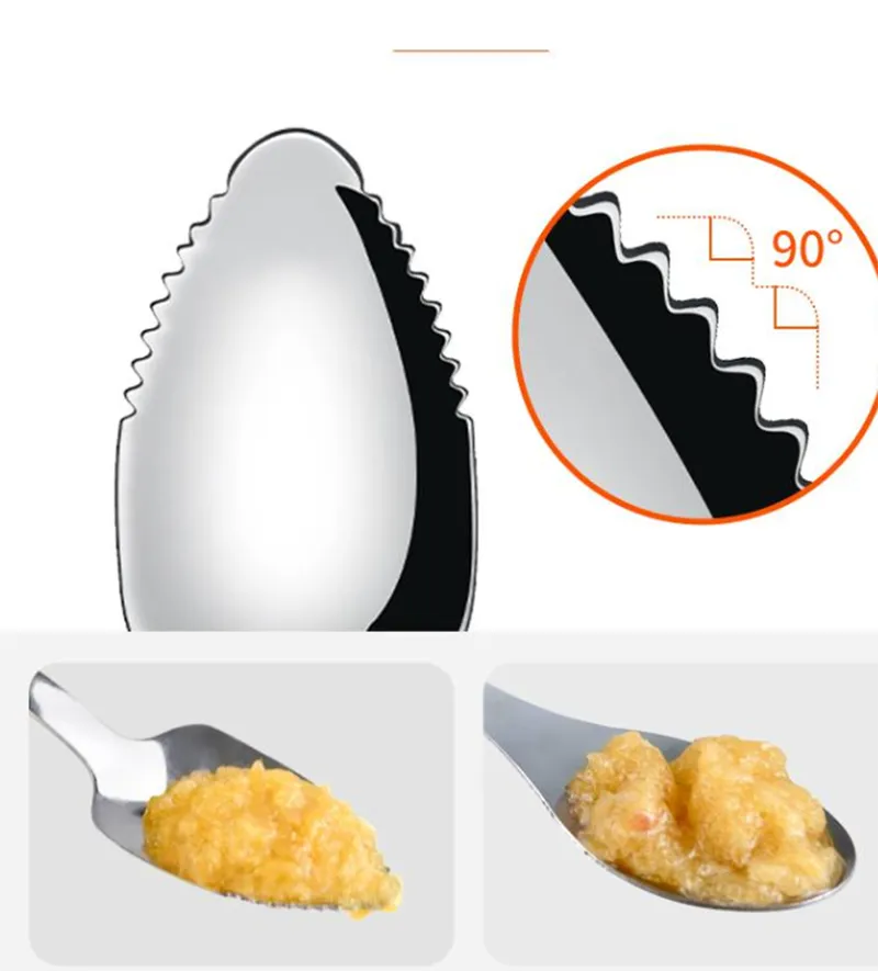 Dual-Function Design The unique double-headed design of this spoon sets it apart from traditional baby spoons. One side features a soft, rounded spoon head ideal for feeding cereals, purees, and other soft foods. The opposite end is equipped with a serrated edge, perfect for scraping and mashing fruits like bananas, avocados, and more. This multifunctional tool reduces the need for multiple utensils, simplifying meal prep and feeding.