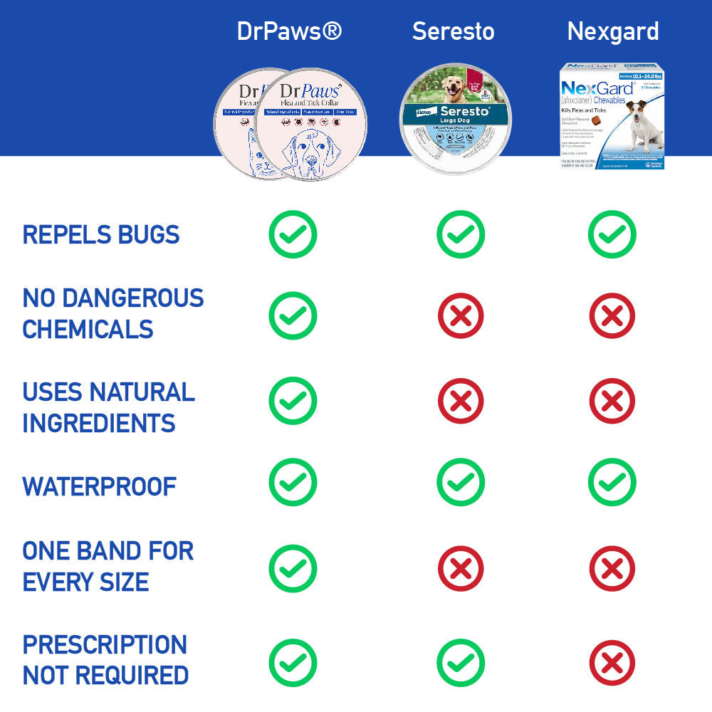 DrPaws® Flea and Tick Free Collar stands out as a natural, chemical-free alternative to conventional pet collars. Suitable for all sizes and waterproof, it offers effective, non-toxic protection without a prescription. Ideal for eco-conscious pet owners, it's a safer, environmentally friendly choice for your pet's well-being.