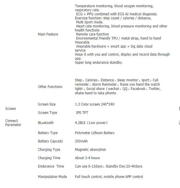 Special Features: Blood oxygen,Body temperature, electrocardiogram, respiratory rate, blood pressure, heart rate, blood oxygen, AI medical