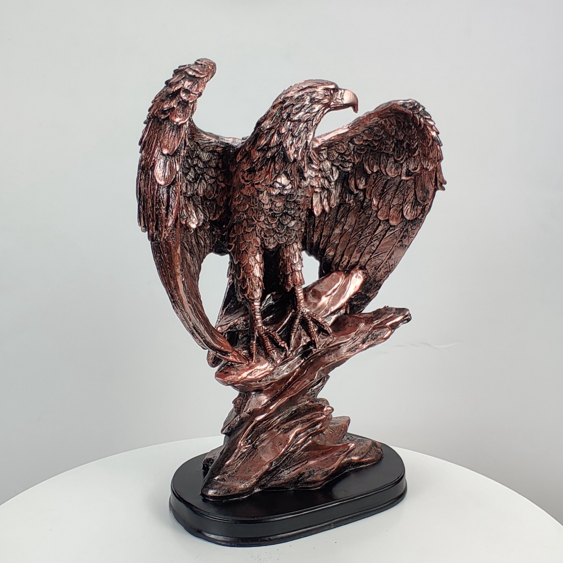 The eagle resin sculpture makes a striking addition to your living room or family room. Place it on a mantel, side table, or bookshelf to create a bold focal point that exudes elegance and strength.