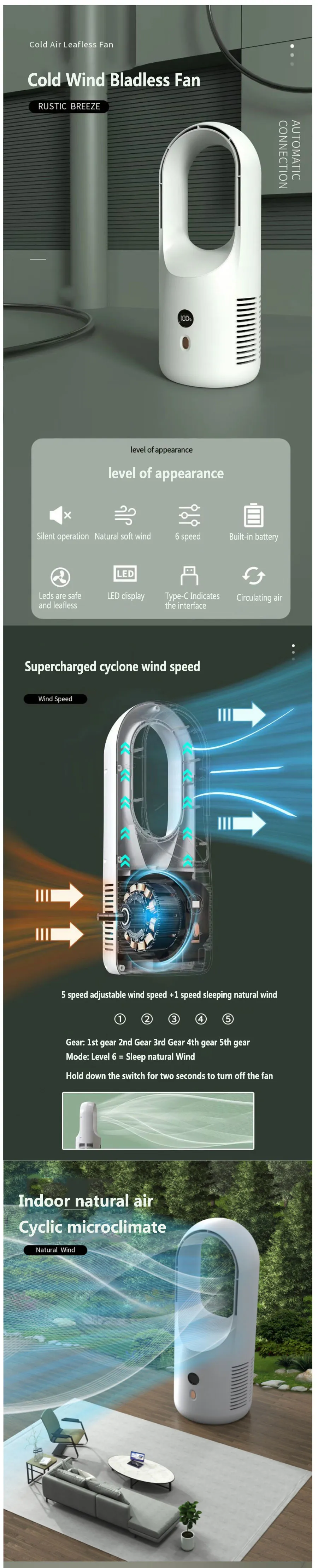 Electric Bladeless Fan Cooler Desktop Portable Usb Rechargable Air Cooling Fan Wireless Led Display Silent 360 Circulation