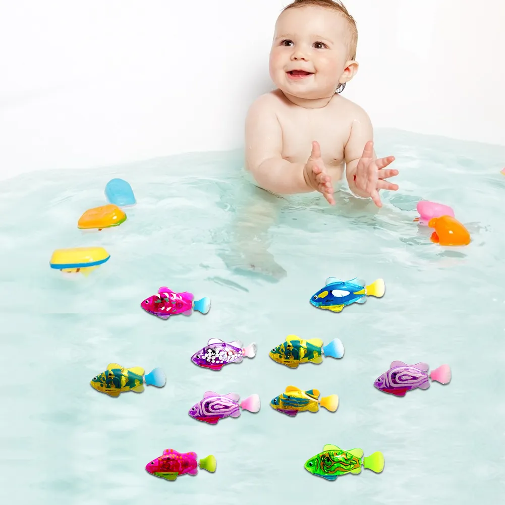 Each of our swimming robot fish toys have built-in LED's that flash when turned on, as well as moving fins for swimming. Perfect for getting