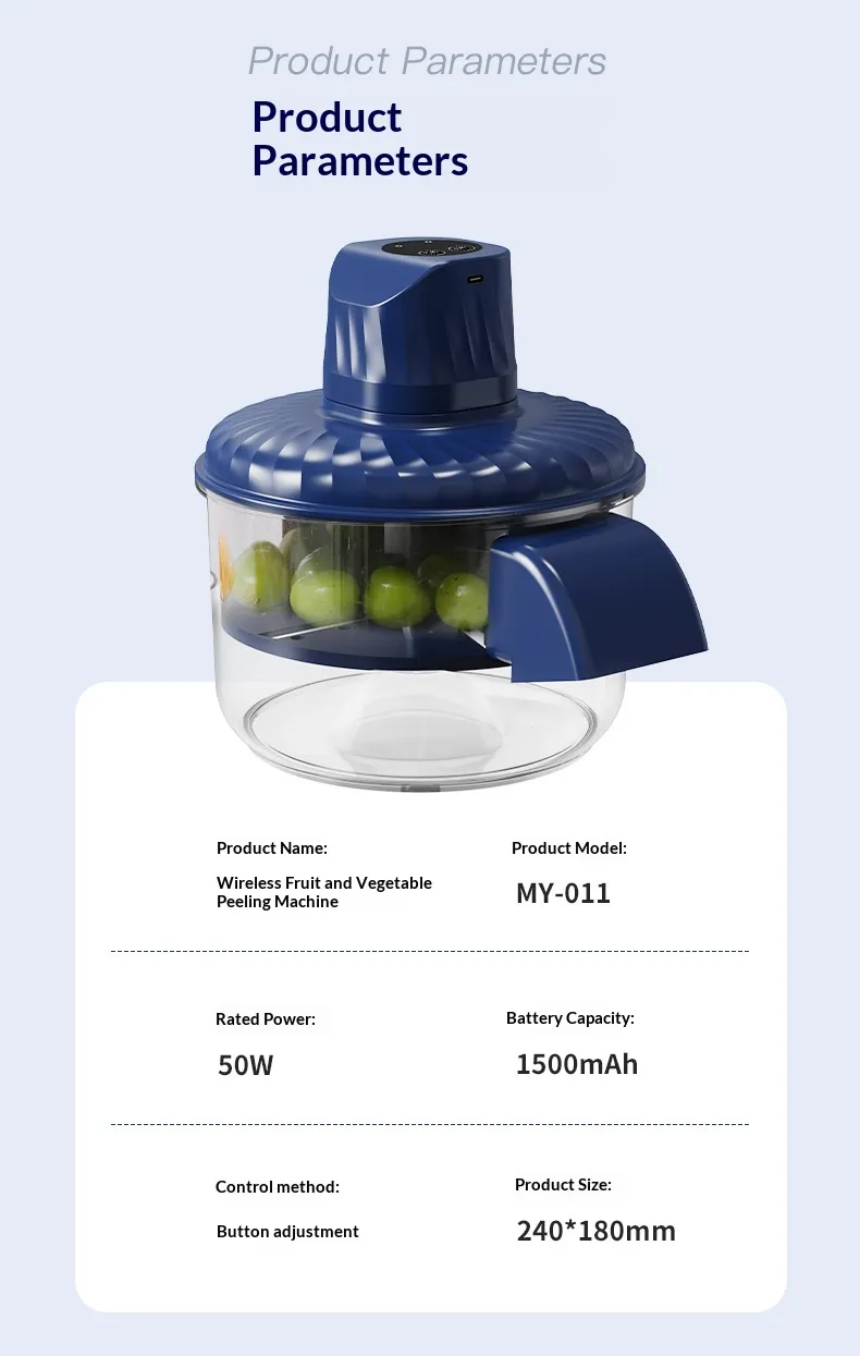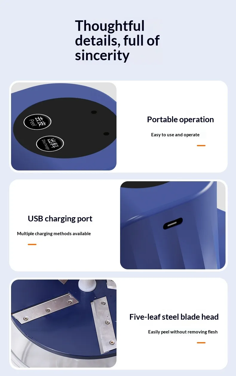 - Wireless & USB Rechargeable Design: No longer is the user tied to a power outlet, as the Automatic Peeler Machine supports both wireless and USB charging. Its compact design keeps the blades covered for added safety. Lightweight and portable, it’s convenient for home use, outdoor activities, or meal prep during gatherings