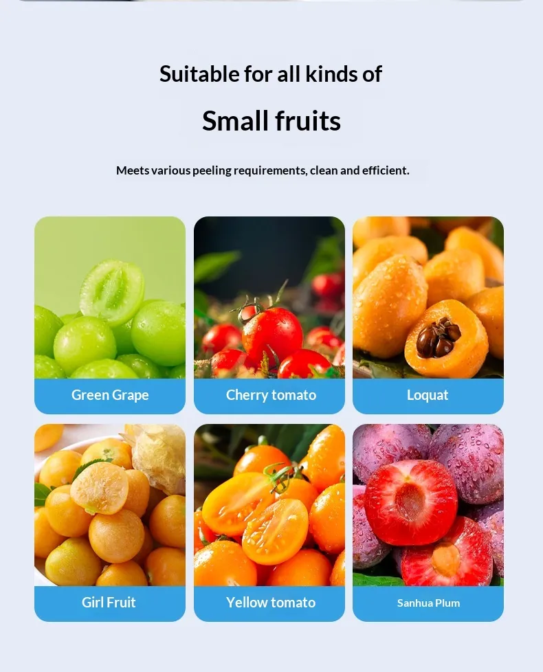 - Durable and Easy to Clean: This automatic peeler quickly handles small, smooth fruits like grapes, cherry tomatoes, and plums, and easily removes garlic skins without rubbing. With a transparent detachable bowl and compact, safe design, it’s perfect for preparing jams, salads, and sauces at home or in commercial kitchens