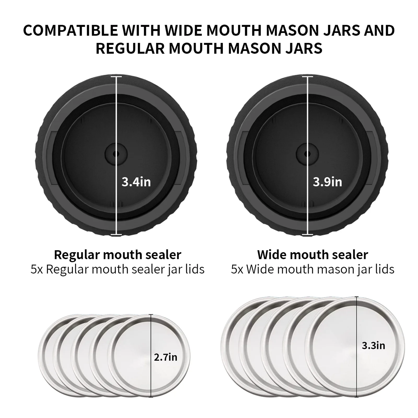 Dual Compatibility The sealer is compatible with both wide-mouth and regular-mouth mason jars, thanks to its dual caliber design. This versatility makes it suitable for sealing various types of jars used for storing candy, grains, dried goods, and more.