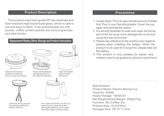 Electric Mixing Mug is an innovative self-stirring drinkware solution designed to simplify beverage preparation. With its built-in electric mixing system, one-button operation, and portable battery-powered design, the mug provides a convenient way to enjoy well-mixed drinks without additional utensils.