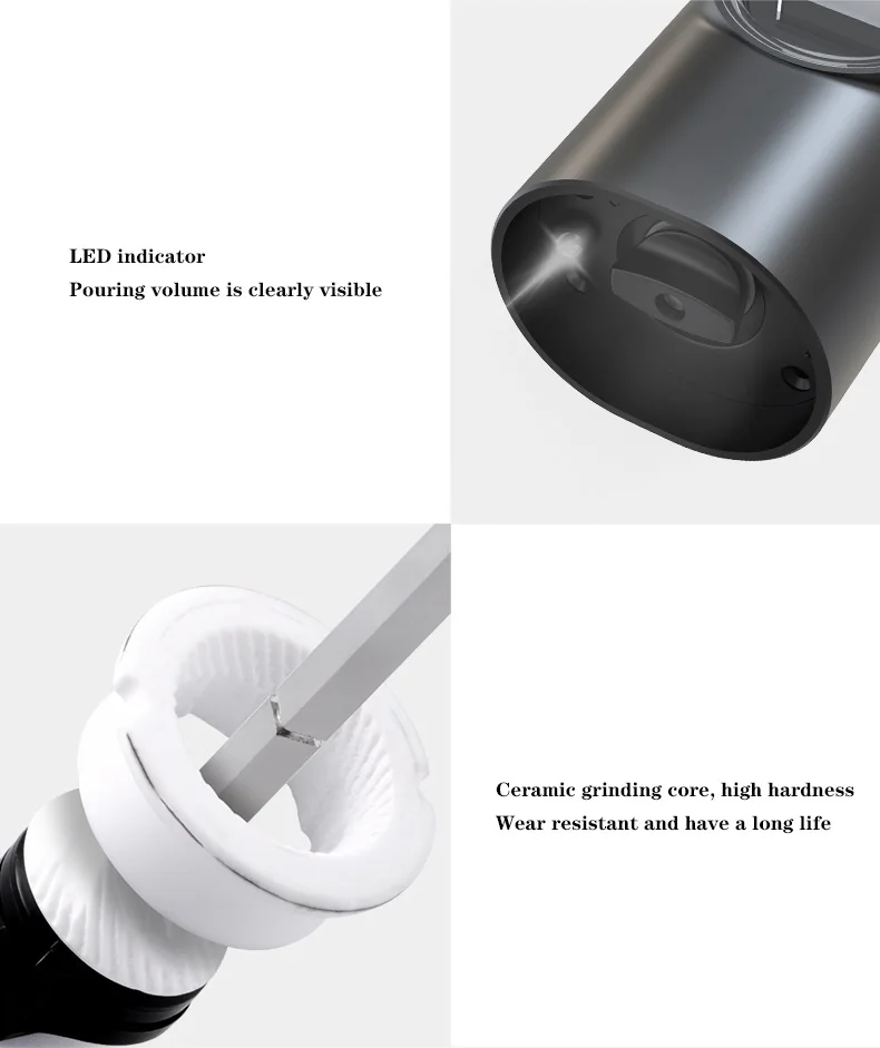 Instead of battery operated, this automatic pepper grinder set comes with a recharging station. It saves your time of changing batteries and the station make it possible to organise and charge your 2 pack salt and pepper set at the same time. And the working noise in under 60DB, which making your kitchen a neat and quiet place.