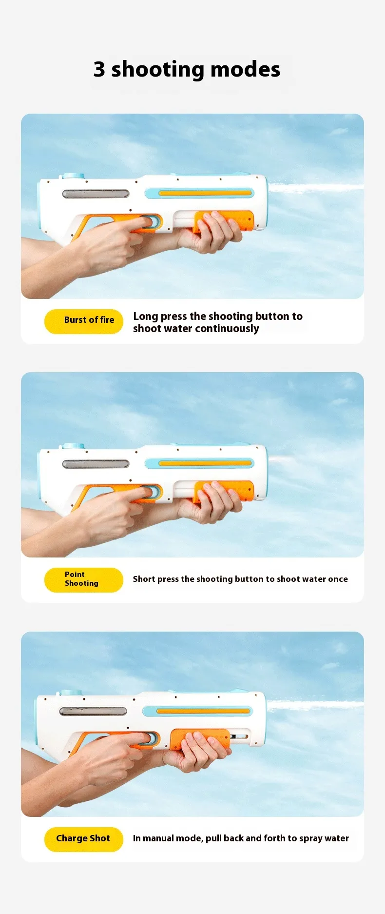 The standout feature of the Electric Water Gun is its integrated electric pump that provides continuous water flow with the press of a button. No need to pump or manually reload between shots—just fill the tank, press the trigger, and the gun will automatically shoot water, allowing you to focus on the fun. This convenient feature makes it a perfect choice for long, uninterrupted water battles with friends and family.