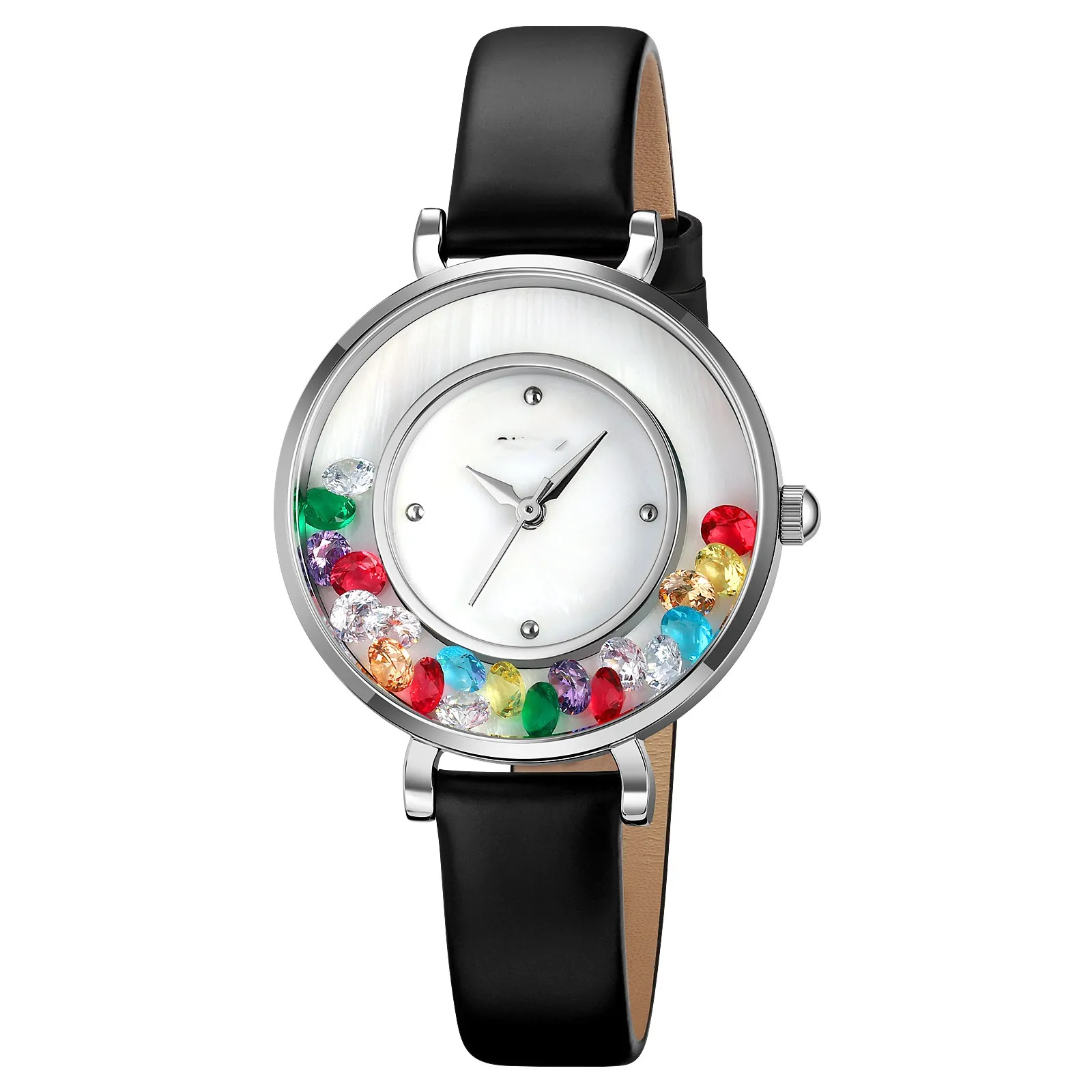 The crystal-clear dial provides a clean and minimalist design, allowing the gemstones and the sleek hands to stand out. The hour markers are simple and easy to read, making it easy to tell the time while enjoying the beauty of the design.