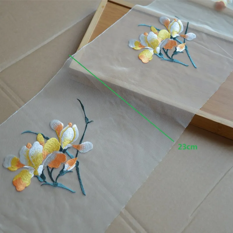- Elegant lace background enhances the vivid floral embroidery