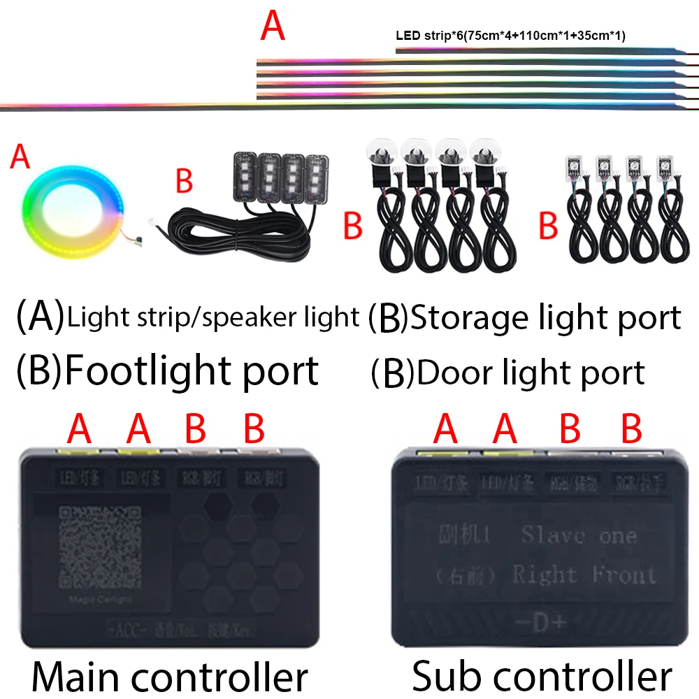 ✨ The light strip and the speaker lights connected to the controller (A) ports, and the (B) ports can be connected to footlights , storage lights and door lights.