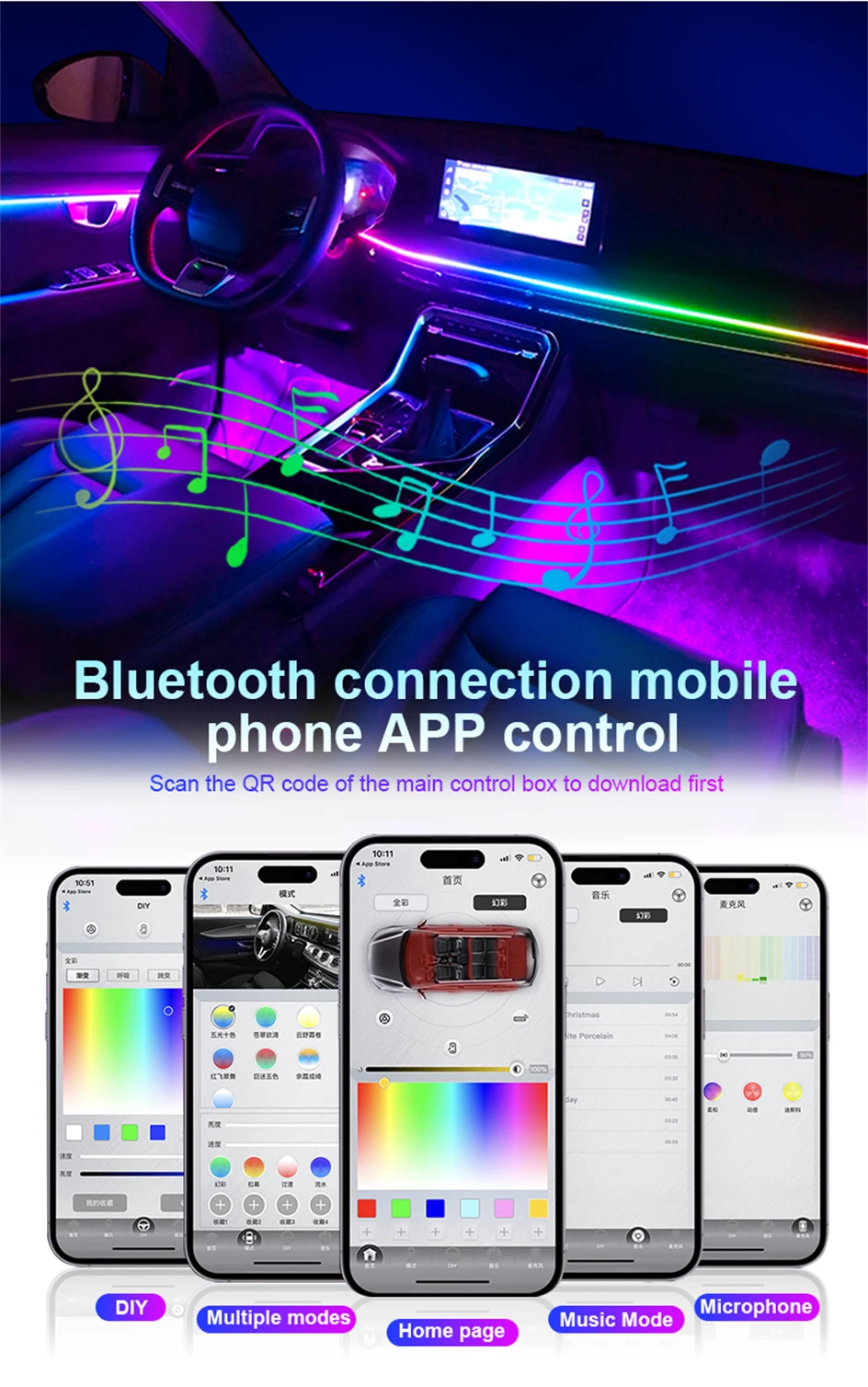 1. Download the application by the QR code on the main control box first, control light mode via Bluetooth connection. This product include 1 main control box ,4 sub control box. Main controller power connect to Acc Fuse, Sub controller power connects to 12V Constant Power