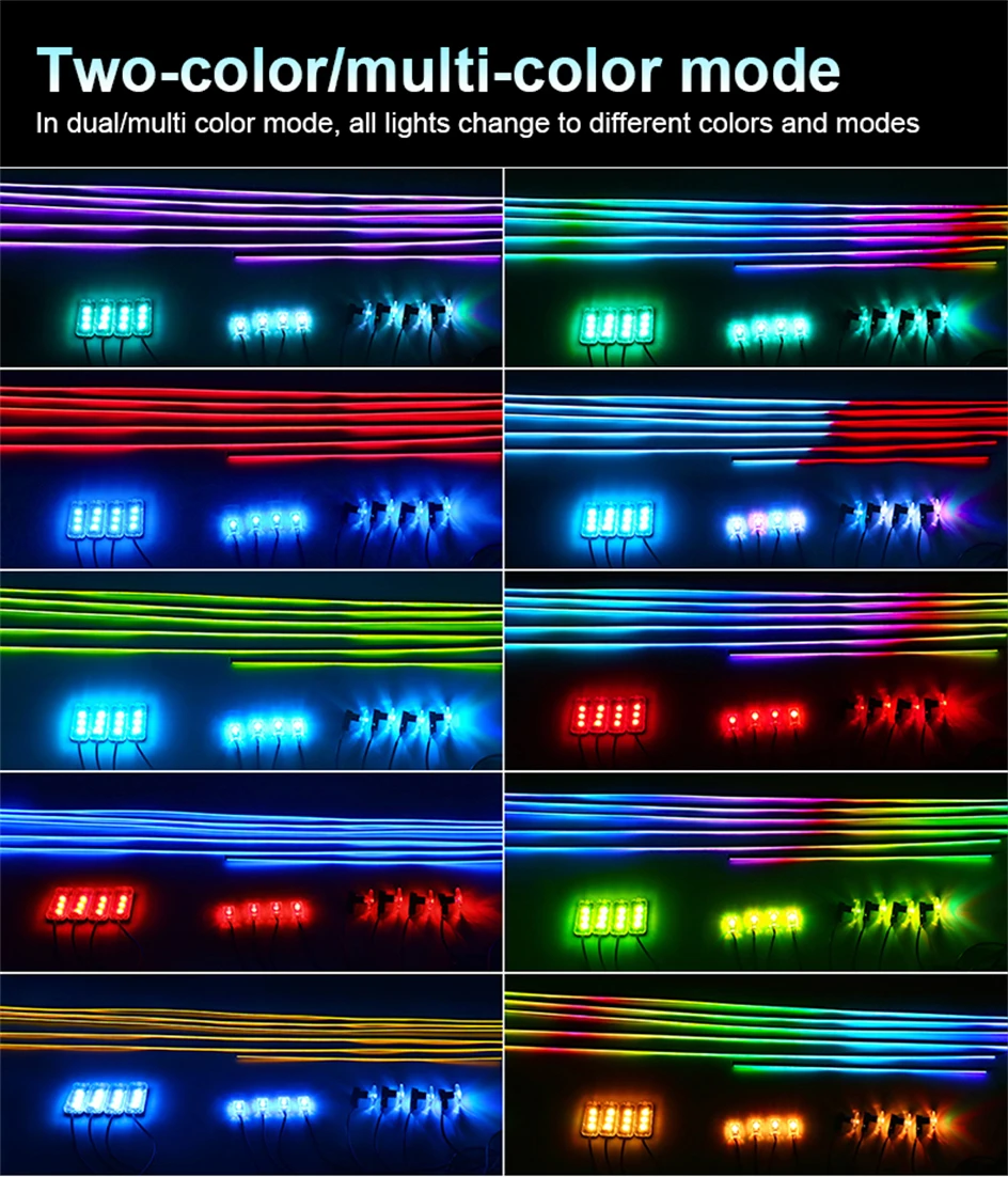 In the single-zone mode, the dual-zone function is added, and the light bar and footlight/door light/storage light provide two different colors at the same time.