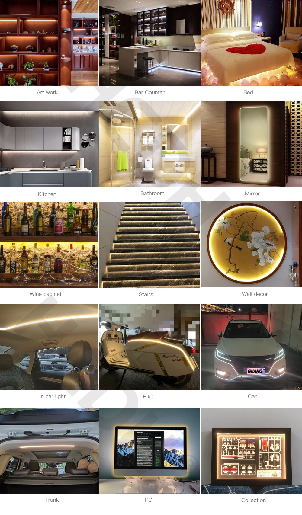Applitcations: Living room, Kitchen, Bathroom, Bedroom, Bar, TV, PC, Car