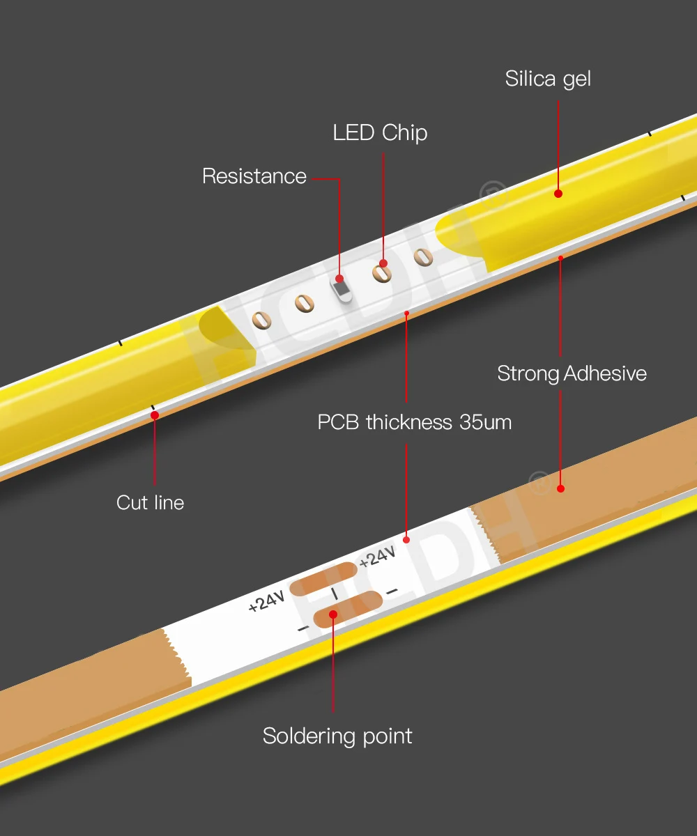 COB is new technology for LED strip manufacturing, provides much more uniform continuous light than traditional SMD LED strip. No dark point