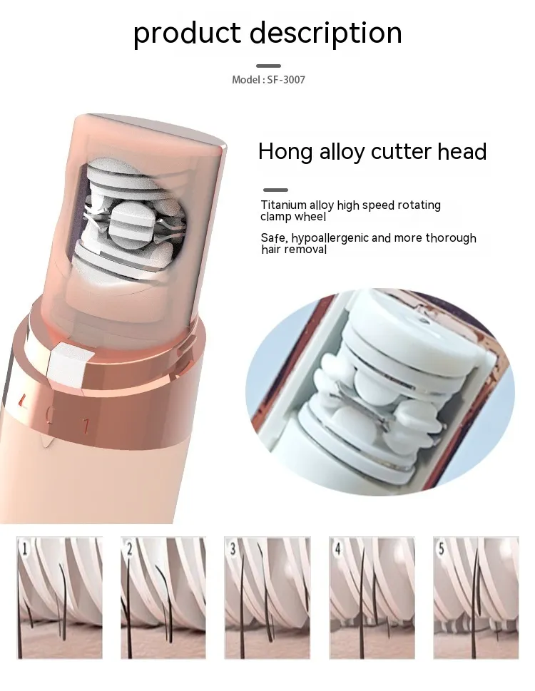 Advanced epilation head: Multiple tweezers or discs capture hairs of varying lengths for efficient removal across body zones.
