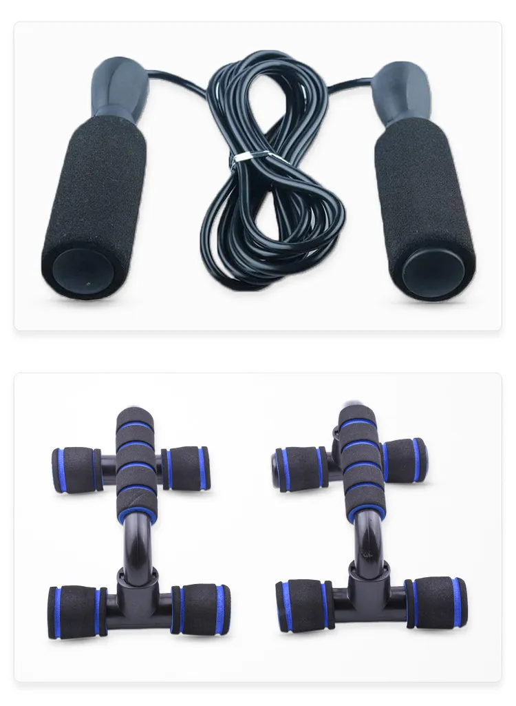 Tanto si te estás iniciando en el fitness como si buscas llevar tu entrenamiento al siguiente nivel, los equipos deportivos y de fitness para el hogar ofrecen una gama de opciones que te ayudarán a alcanzar tus objetivos. Encontrarás todo lo que necesitas para crear una rutina de fitness efectiva y agradable. Con el equipo adecuado, puedes entrenar en la comodidad de tu hogar y lograr los resultados que deseas. ¡Manténgase activo, saludable y motivado con el mejor equipo de fitness para su hogar! 1. Equipo de entrenamiento 5 en 1 para el hogar: el kit incluye una cuerda de saltar ajustable, una pinza, un putter y un rodillo abdominal con rodilleras. 2. El nuevo rodillo abdominal de Actualizado: Este nuevo rodillo abdominal está hecho con un tubo de mango más largo y está cubierto con una espuma antideslizante resistente para mayor estabilidad. 3. Excelente soporte reforzado: la varilla curva se puede quitar o instalar en segundos y no se desliza fácilmente. 4. Pinzas: Las pinzas son excelentes herramientas para fortalecer manos y brazos, lo que garantiza un agarre seguro y efectivo. 5. Apto para todos los niveles de condición física: este completo equipo de fitness para todos los niveles de condición física es adecuado para principiantes y avanzados. Descripción: Conjunto deportivo: rueda abdominal, soporte para flexiones, agarre, comba para saltar. src="https://cf.cjdropshipping.com/16778016/1631723083847045120.jpg?x-oss-process=image%2Fformat%2Cwebp" max-width="790" />