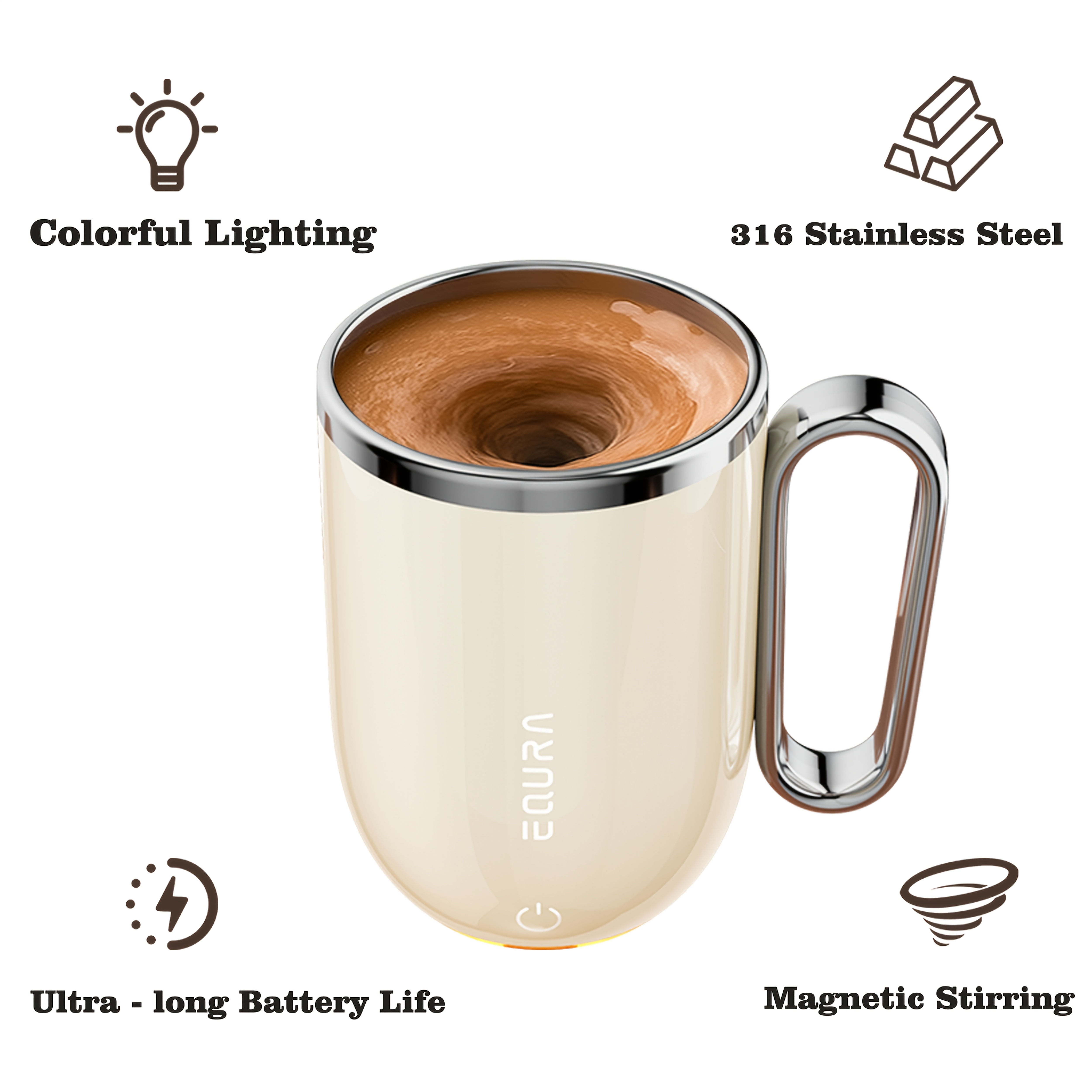 The eQUra Self-Stirring Mug uses magnetic rotation technology to blend liquids smoothly at the press of a button. Whether you're mixing coffee, milk, chocolate drinks, pre-workout, or flavoured beverages, the internal magnetic stirrer provides consistent and effortless blending without clumps.