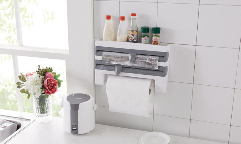 Diseño multifuncional: La estación de cocina QuadraWrap está equipada para cuatro tipos de rollos diferentes: papel de cocina, papel de aluminio, film transparente y papel de horno. Esta estación todo en uno le garantiza tener todo lo que necesita a mano, ahorrando espacio y reduciendo el desorden.