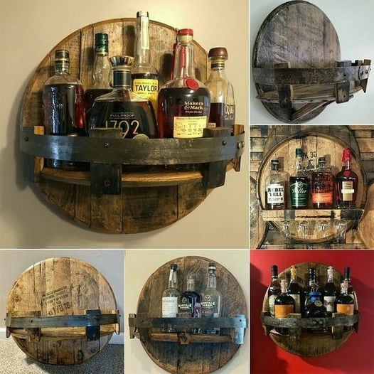 Muestre su colección de bourbon o whisky en este estante hecho completamente con cabezas de barriles de bourbon de whisky, duelas y las bandas de metal