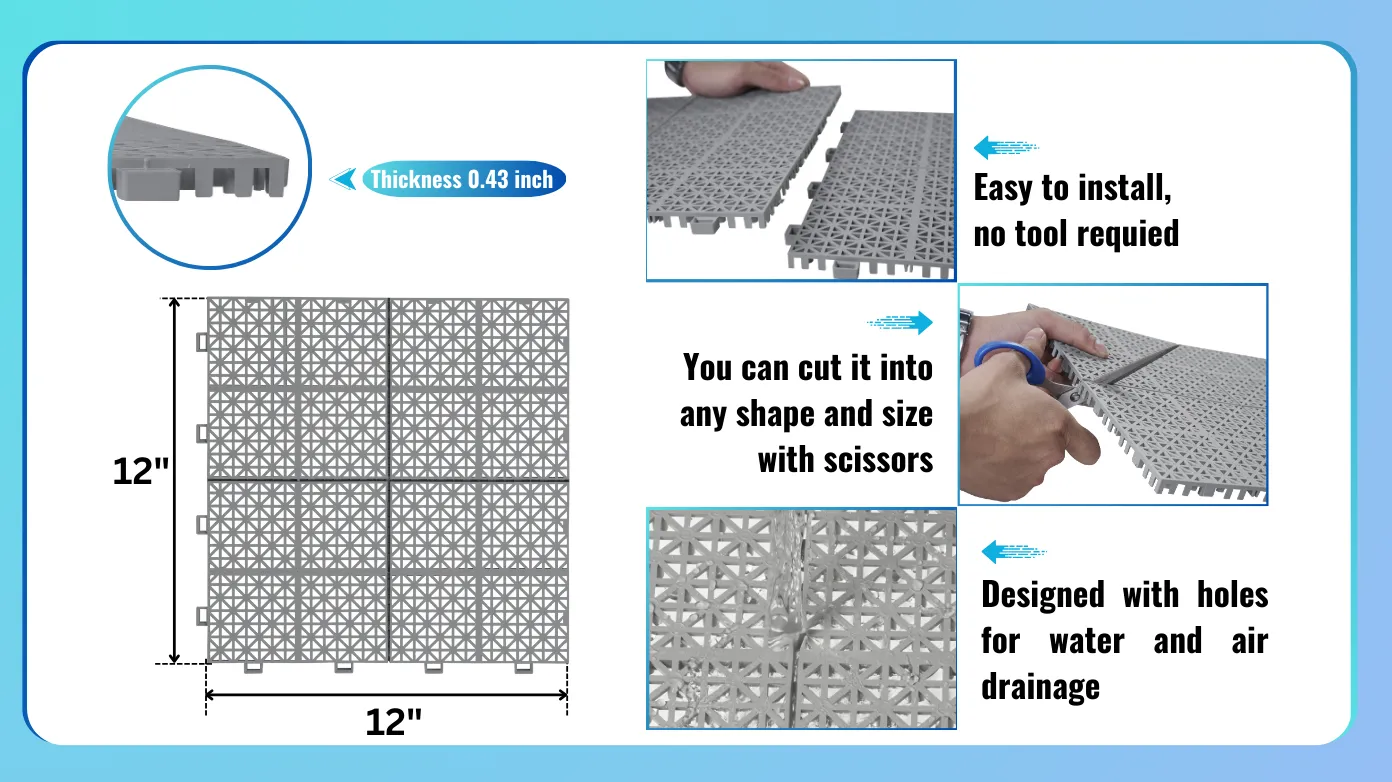 CUSTOMIZABLE & VERSATILE USAGE: Our 12 x 12 inch interlocking deck tiles can be easily cut to size using a saw or other cutting tools.