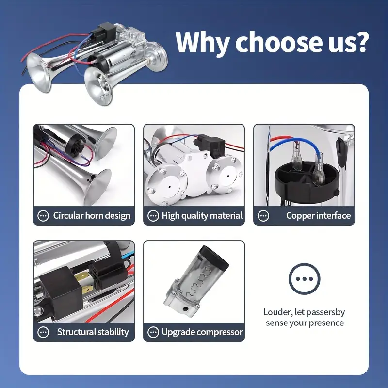 The air horn features a dual horn powered by an air compressor, made from enhanced materials for durability. Product Name: Silver Double Tube Whistle. Material: Metal. Color: Silver. Functionality: 12V. Power Source: Electrical/Hardwired. Application: Designed for 12V vehicles with batteries, including trucks, ships, trains, cars, sedans, trams, and modified vehicles.Enhance the internal parts of the air compressor so that the horn can produce an extremely loud sound. Increase the thickness of the copper wire in the circuit. The transformer has been internally upgraded to better suit 12v vehicles, stabilizing the current and allowing for maximum current release to amplify the sound.Enhance the standard metal at the base of the horn and the exterior of the air compressor by using zinc alloy. This way, the speaker significantly prolongs its lifespan.'%3E%3Crect x='0' y='0' width='1024' height='1024' fill='%2348464c'/%3E%3Cg transform='scale(4.00) translate(0.5 0.5)'%3E%3Cg transform='translate(198.72 187.48) rotate(294.03) scale(41.65 26.84)'%3E%3Cellipse fill='%23bfcdcf' fill-opacity='0.50' cx='0' cy='0' rx='1' ry='1'/%3E%3C/g%3E%3Cpolygon fill='%23edfbff' fill-opacity='0.50' points='103,102 155,161 101,173'/%3E%3Cg transform='translate(127.39 48.89) rotate(96.45) scale(25.90 87.87)'%3E%3Cellipse fill='%23000000' fill-opacity='0.50' cx='0' cy='0' rx='1' ry='1'/%3E%3C/g%3E%3Crect fill='%23ffffff' fill-opacity='0.50' x='24' y='153' width='59' height='22'/%3E%3Cg transform='translate(174.29 232.12) rotate(195.23) scale(18.36 31.16)'%3E%3Cellipse fill='%23c1ccd3' fill-opacity='0.50' cx='0' cy='0' rx='1' ry='1'/%3E%3C/g%3E%3Cg transform='translate(40.07 123.49) rotate(193.05) scale(67.53 24.77)'%3E%3Cellipse fill='%23160000' fill-opacity='0.50' cx='0' cy='0' rx='1' ry='1'/%3E%3C/g%3E%3Cg transform='translate(154.37 185.89) rotate(228.68) scale(22.97 29.65)'%3E%3Cellipse fill='%23000007' fill-opacity='0.50' cx='0' cy='0' rx='1' ry='1'/%3E%3C/g%3E%3Cellipse fill='%23130c0d' fill-opacity='0.50' cx='193' cy='105' rx='48' ry='48'/%3E%3Cg transform='translate(193 162) rotate(270) scale(22 37)'%3E%3Crect fill='%23fffff6' fill-opacity='0.50' x='-0.5' y='-0.5' width='1' height='1'/%3E%3C/g%3E%3Cpolygon fill='%237e8fa8' fill-opacity='0.50' points='-13,271 5,225 169,253'/%3E%3C/g%3E%3C/g%3E%3C/svg%3E)