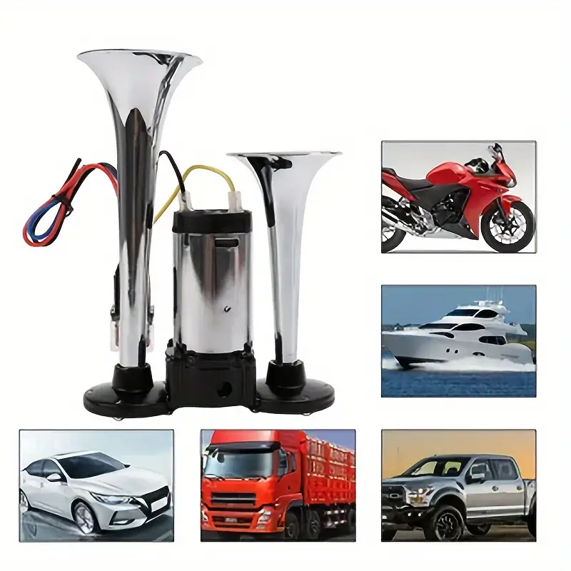 The air horn features a dual horn powered by an air compressor, made from enhanced materials for durability. Product Name: Silver Double Tube Whistle. Material: Metal. Color: Silver. Functionality: 12V. Power Source: Electrical/Hardwired. Application: Designed for 12V vehicles with batteries, including trucks, ships, trains, cars, sedans, trams, and modified vehicles.Enhance the internal parts of the air compressor so that the horn can produce an extremely loud sound. Increase the thickness of the copper wire in the circuit. The transformer has been internally upgraded to better suit 12v vehicles, stabilizing the current and allowing for maximum current release to amplify the sound.Enhance the standard metal at the base of the horn and the exterior of the air compressor by using zinc alloy. This way, the speaker significantly prolongs its lifespan.