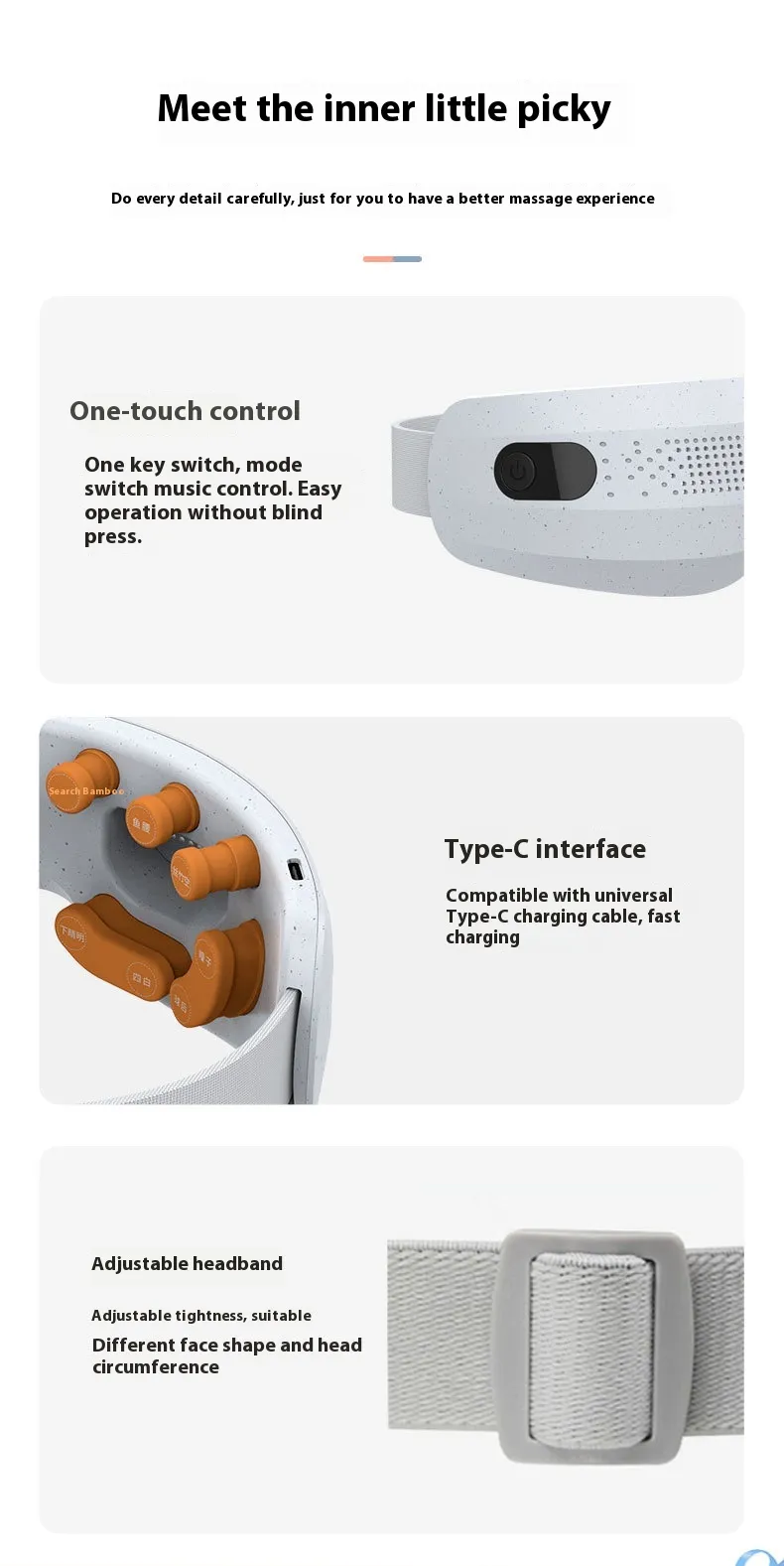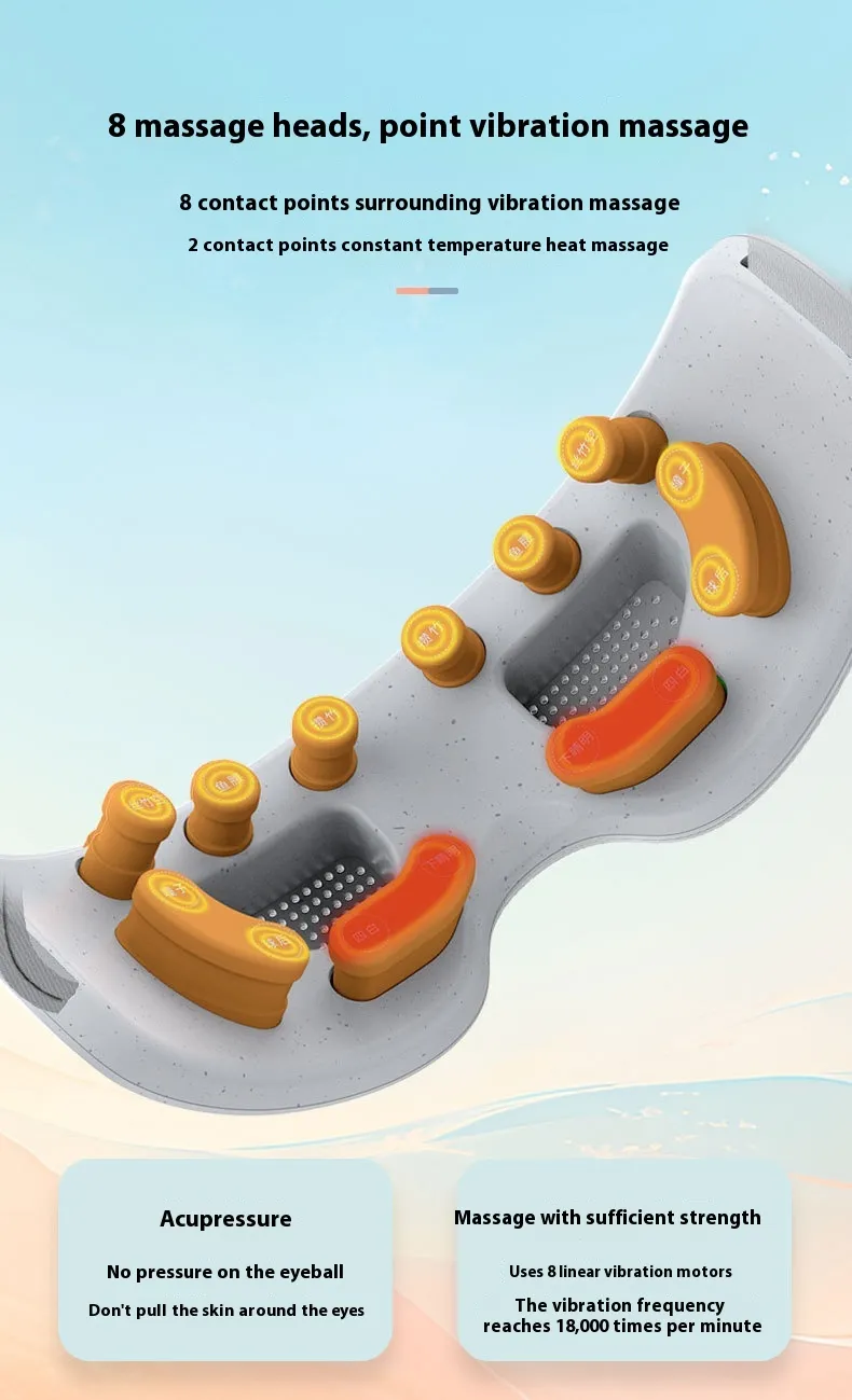 Vibration Massage: The built-in vibration feature enhances the massage experience, offering deeper relaxation and helping to relieve stress and muscle tightness around the eyes and temples.