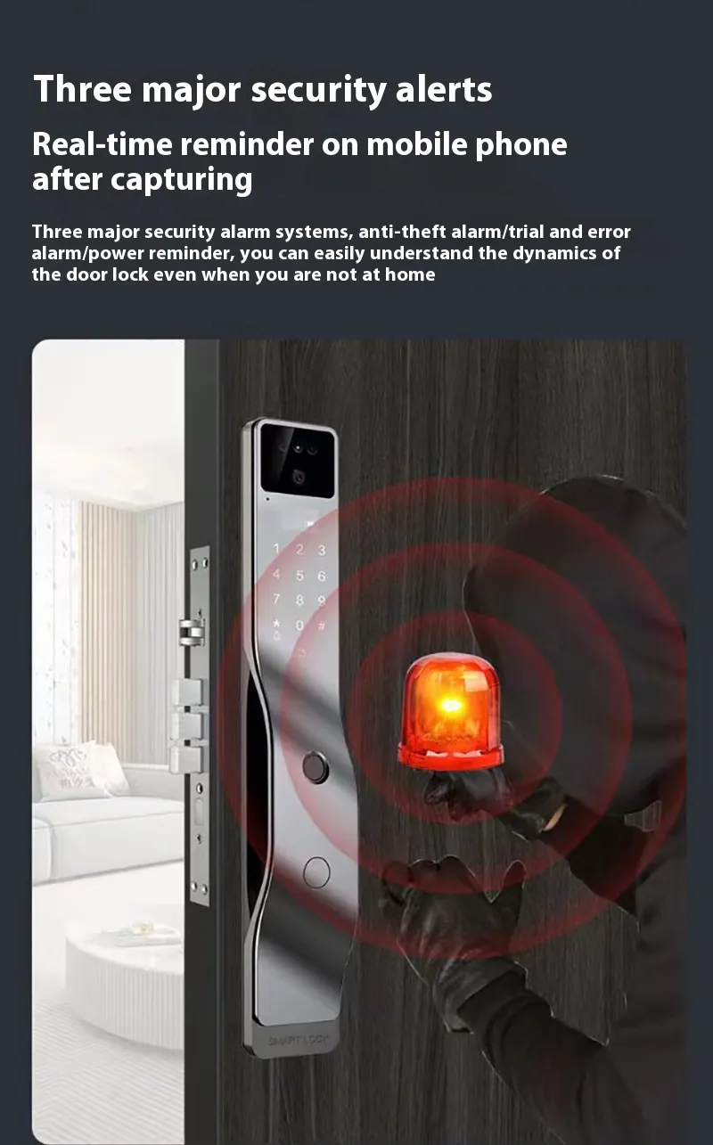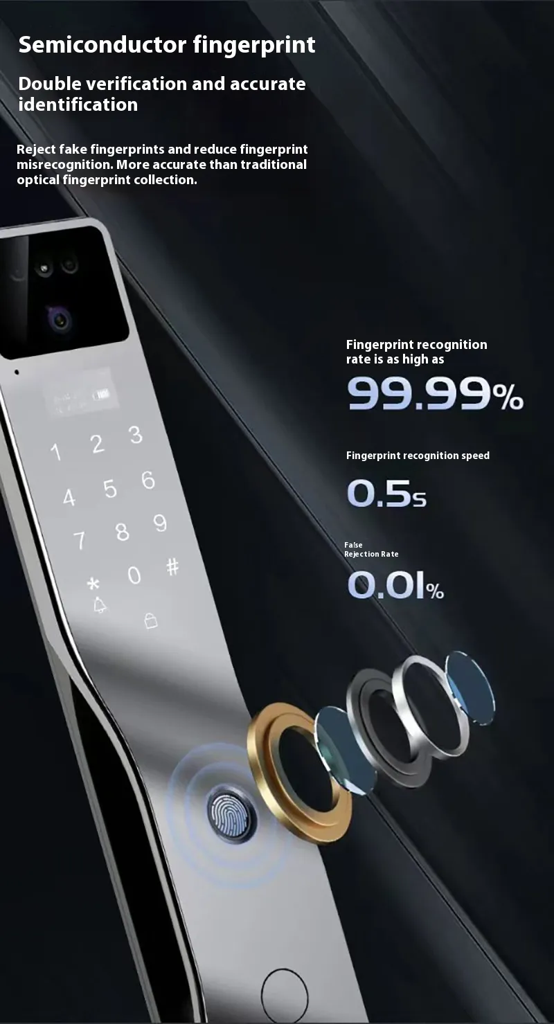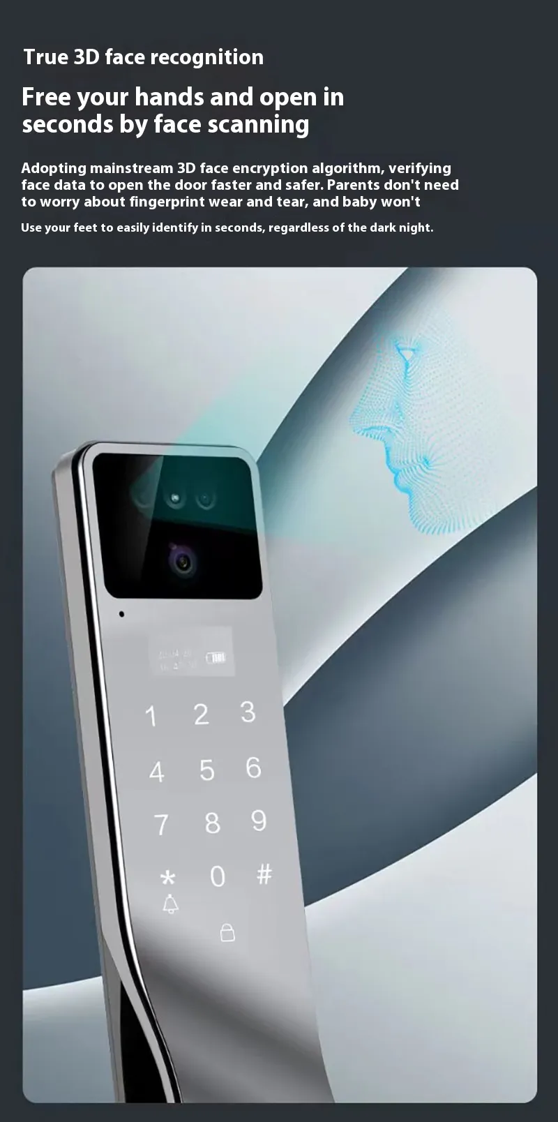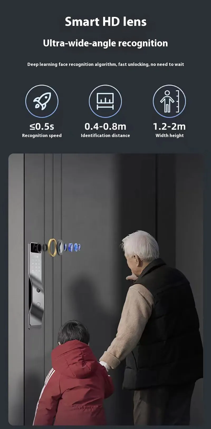 This smart lock supports face recognition, fingerprint unlock, password, IC card, and mechanical key backup. Its 360° fingerprint sensor ensures quick and accurate access in just seconds, while the AI face recognition system provides enhanced security against unauthorized entry.