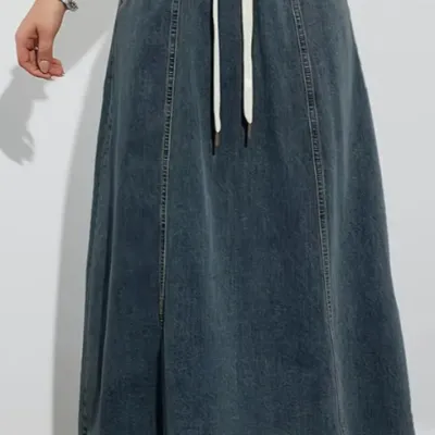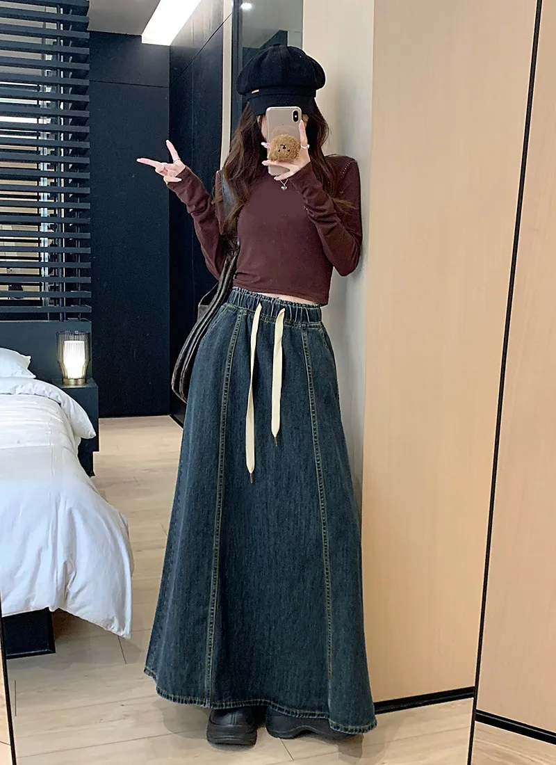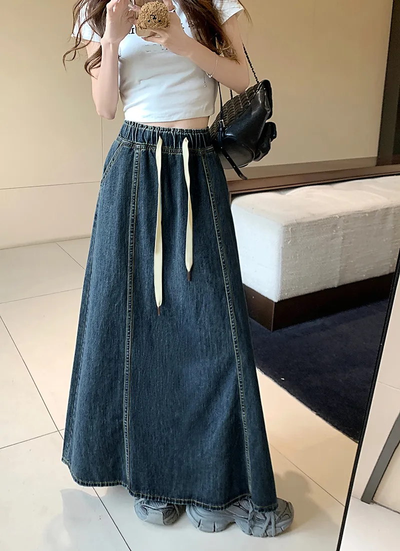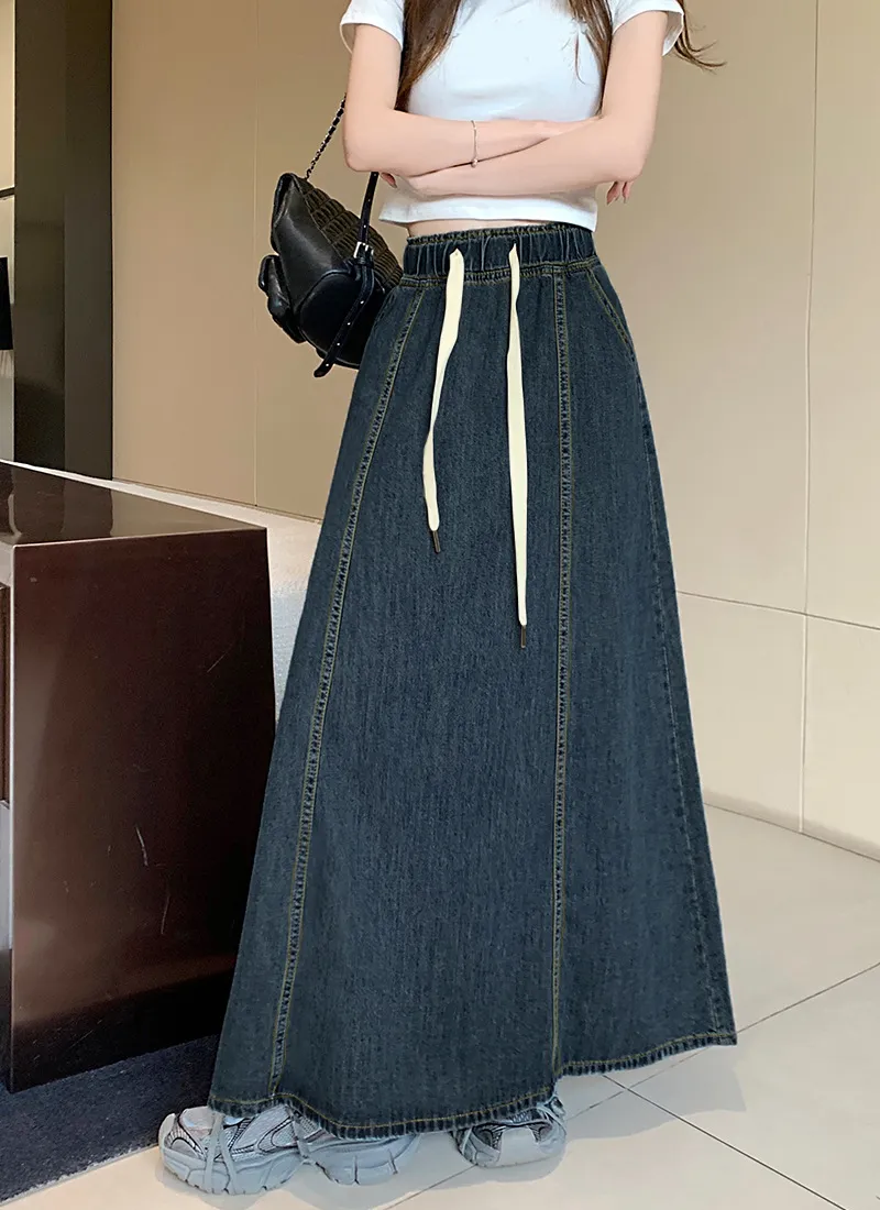 Consejos de estilo para la falda vaquera azul oscuro con cordón y cintura elástica