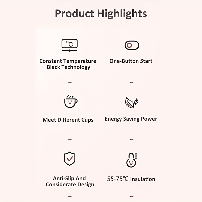 It offers three temperature levels—low, medium, and high—allowing users to customize warmth for coffee, tea, milk, herbal infusion, or hot water. The built-in 8-hour safety timer automatically powers off the device, preventing overheating and ensuring energy-efficient use during long work or study sessions.