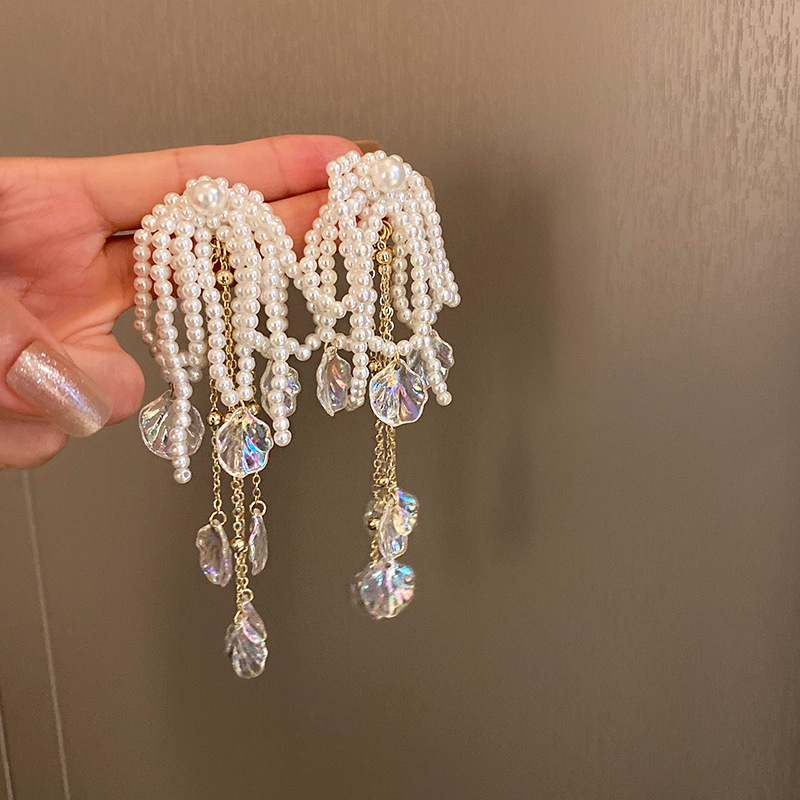 Female Exaggerated Long Pearl Earrings Shell Bow Tassel Earrings