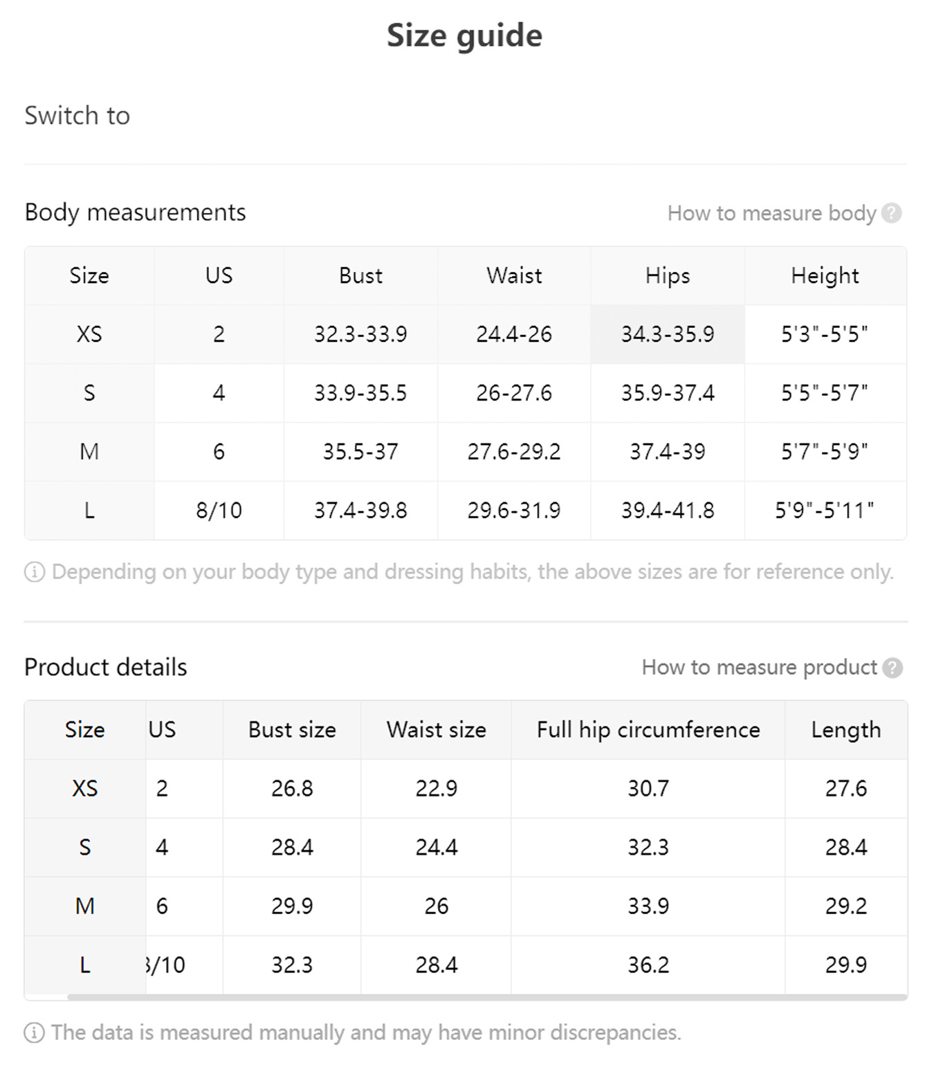 between two sizes. Please allow 2-3cm differences due to manual measurement.