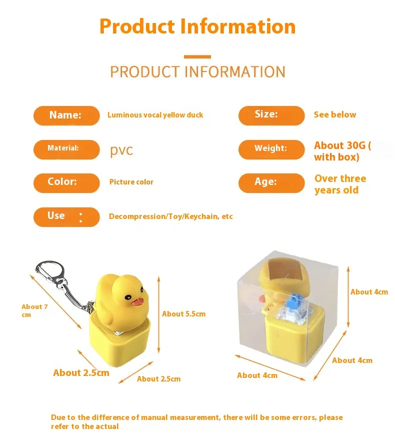 The toy is designed to be easy to hold and comfortable to use repeatedly. Its responsive action encourages rhythmic squeezing or pressing, which can help release nervous energy, reduce stress, and support concentration during tasks such as studying, working, or waiting. The quacking sound is intentionally playful, making the toy enjoyable without requiring screens, batteries (where applicable), or complex setup.