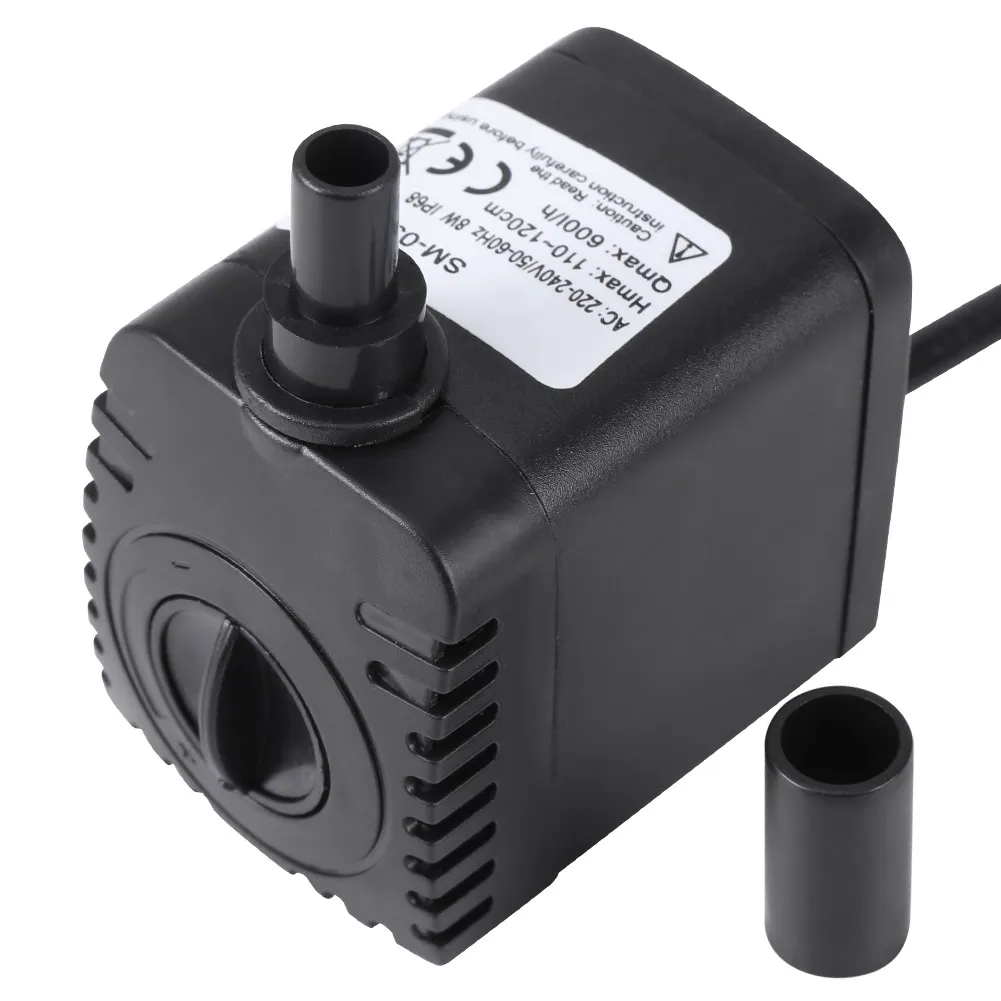 Bomba de 8W, flujo máximo. Tiene una capacidad de 600 l/h y una altura máxima de elevación de 110-120 cm.