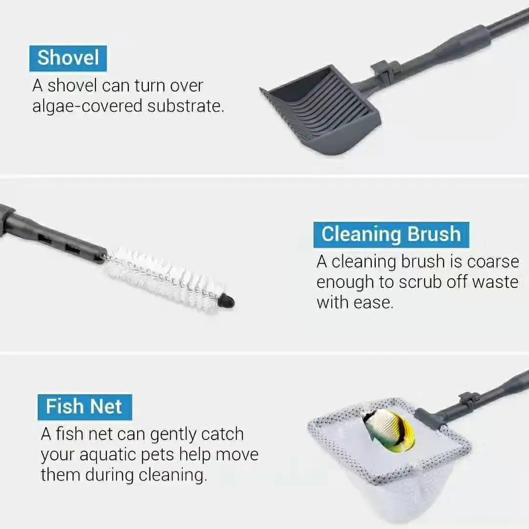 Versatile Cleaning Attachments: Brushes designed for different tasks, including algae scraping, glass cleaning, substrate