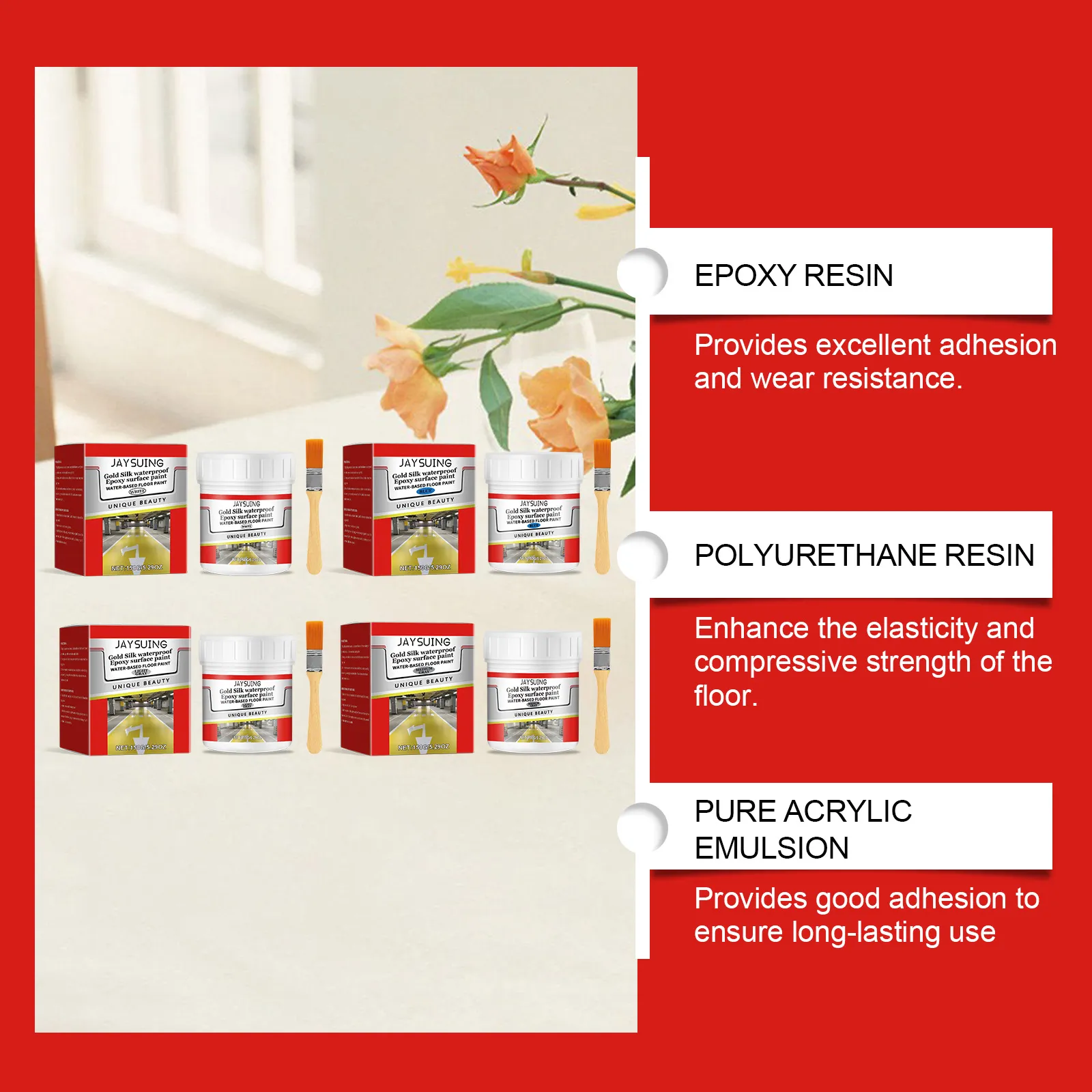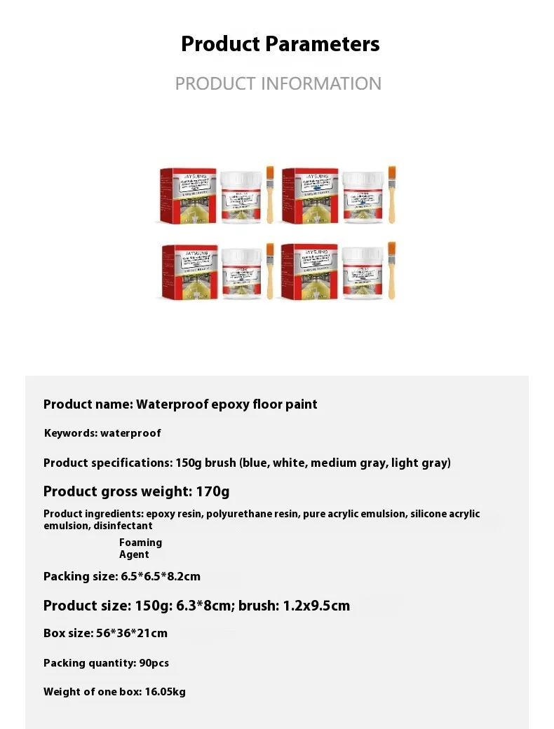 Product ingredients: epoxy resin, polyurethane resin, pure acrylic lotion, silicone acrylic lotion