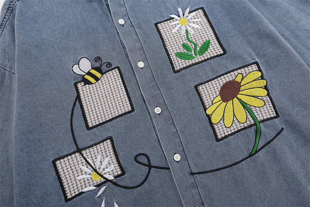 Add a Touch of Elegance to Your Wardrobe with the Floral Embroidery Denim Washed Shirt Coat