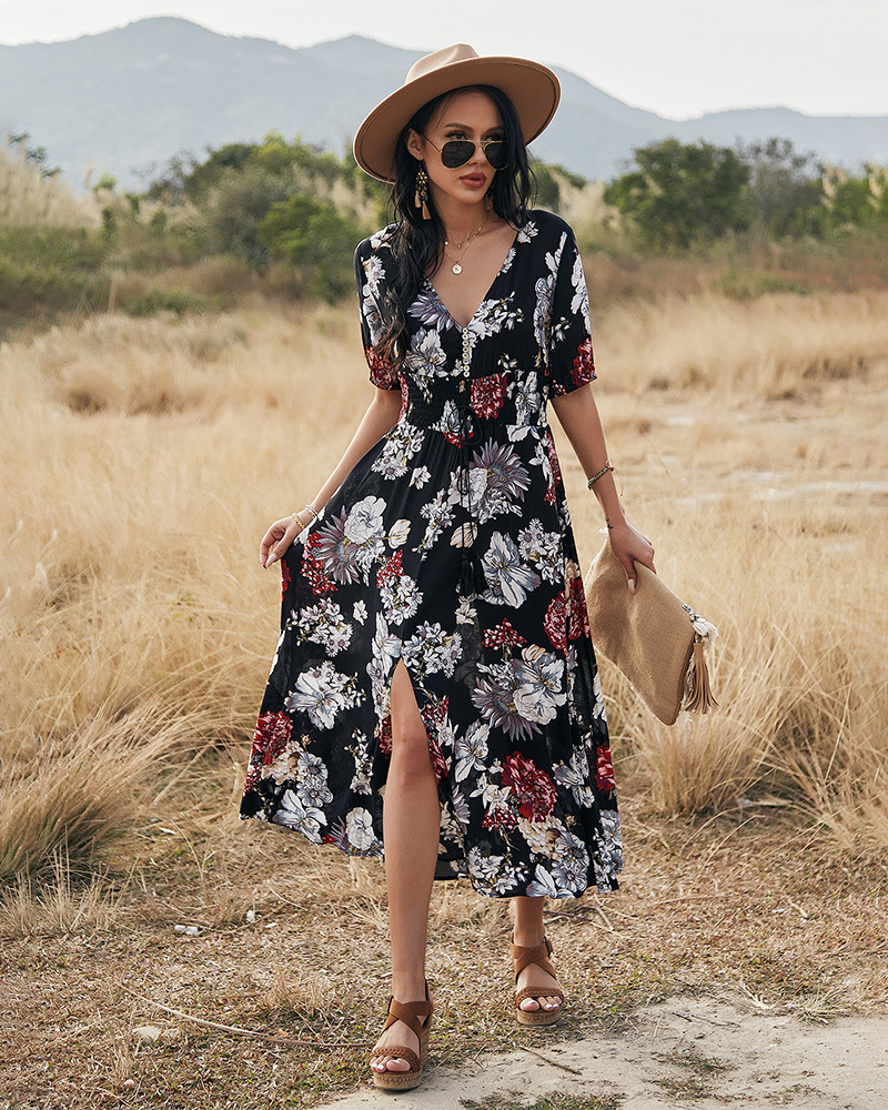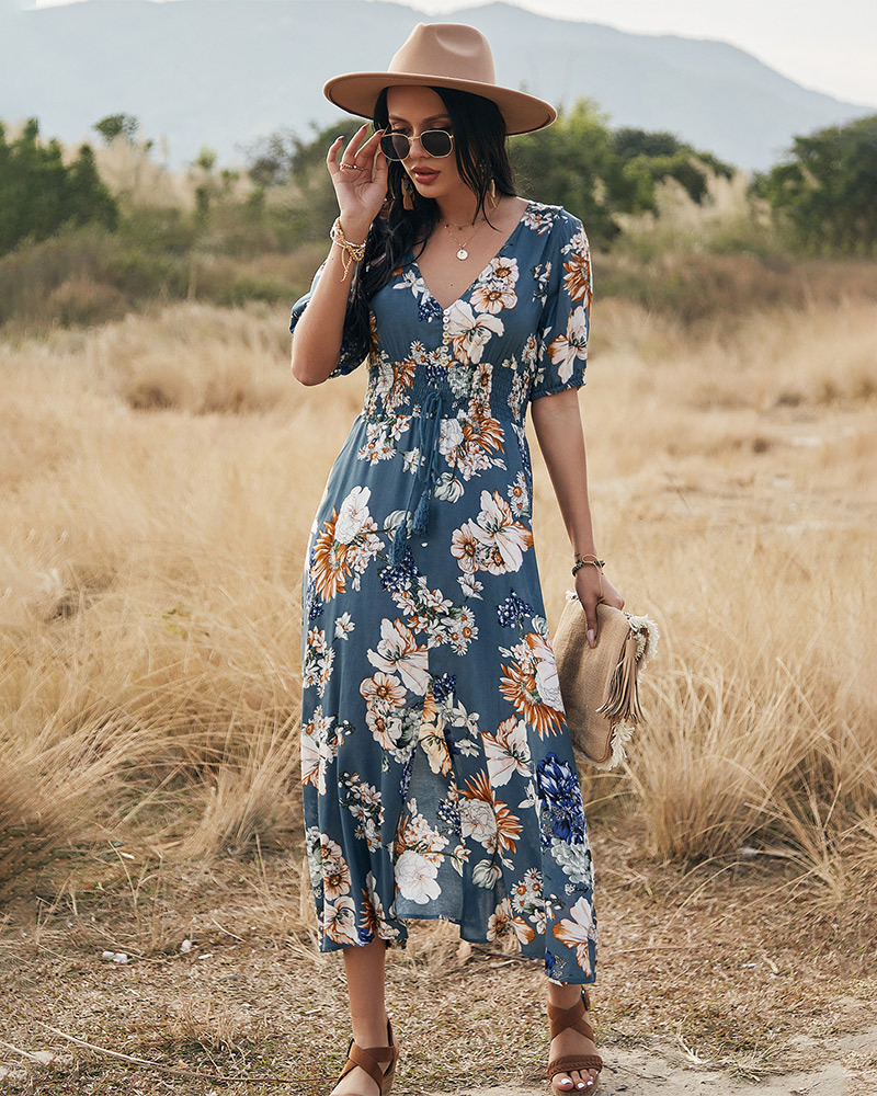 Floral V-Neck Elastic Waist Summer Beach Dress