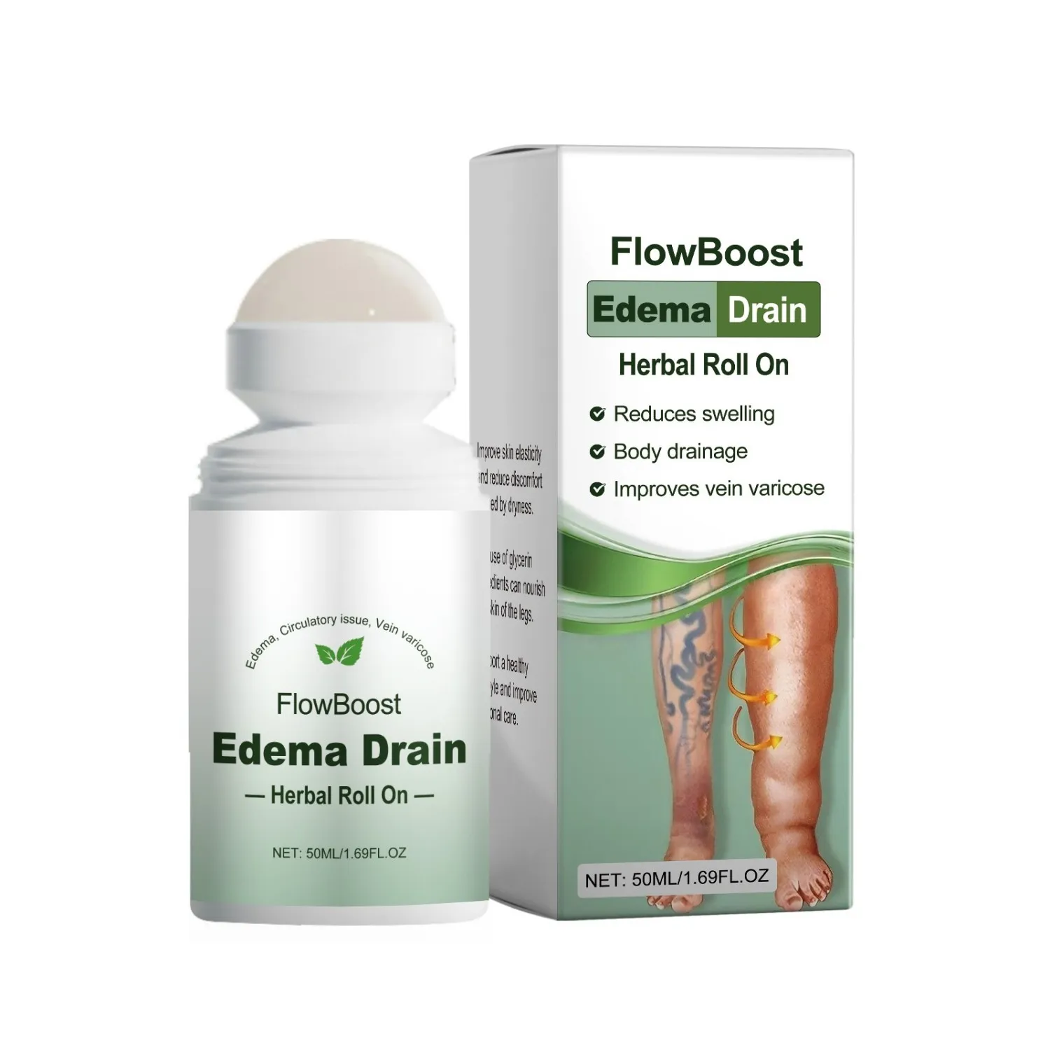 FlowBoost Edema Drain Herbal Roll-On reduces swelling, improves circulation, and supports healthy veins. Perfect for edema, vein varicose, and daily use with a herbal formula.