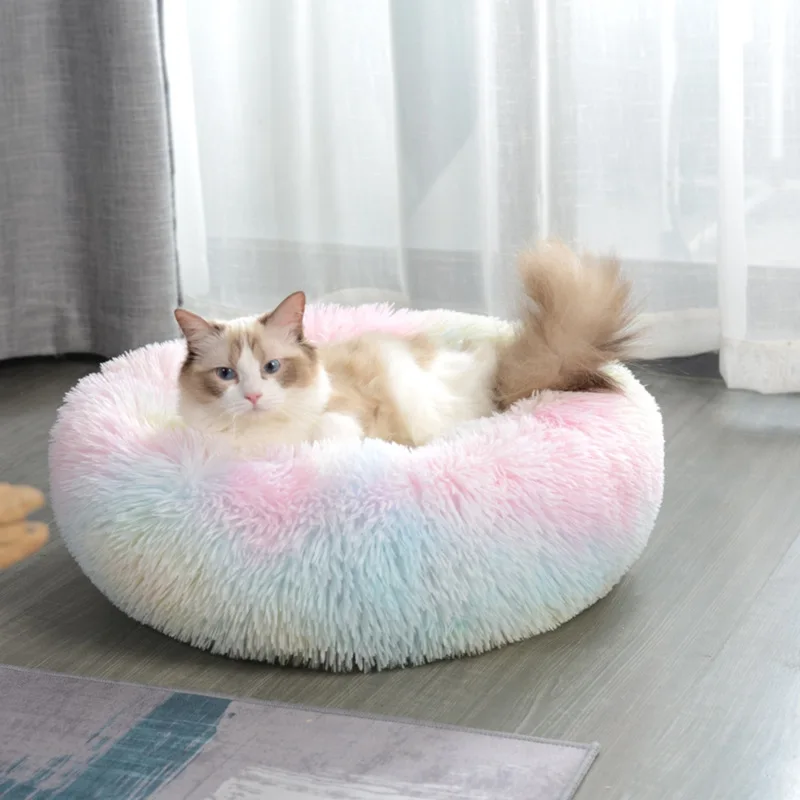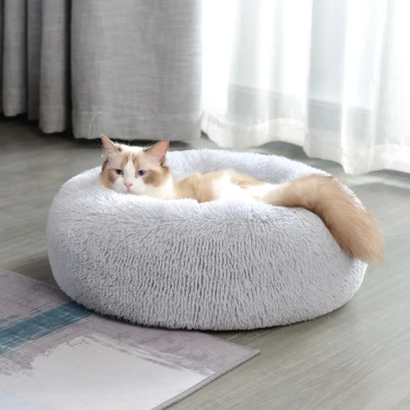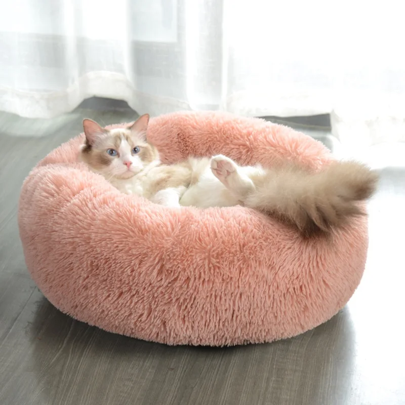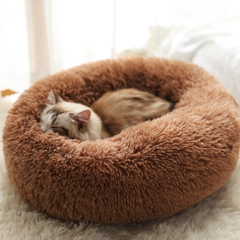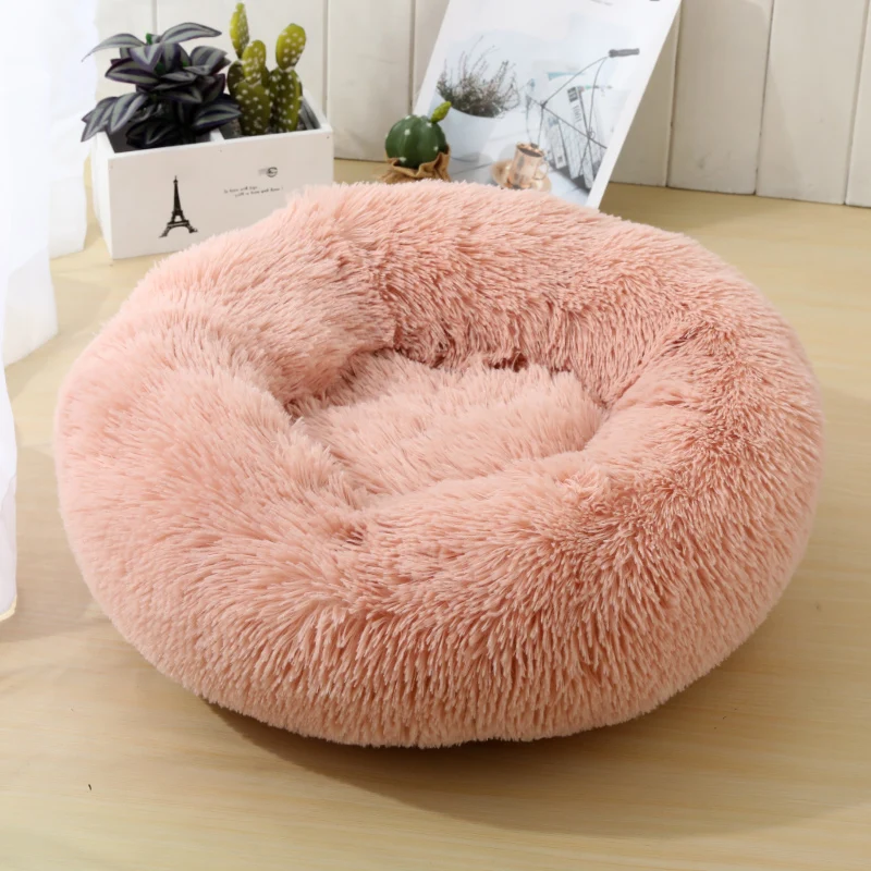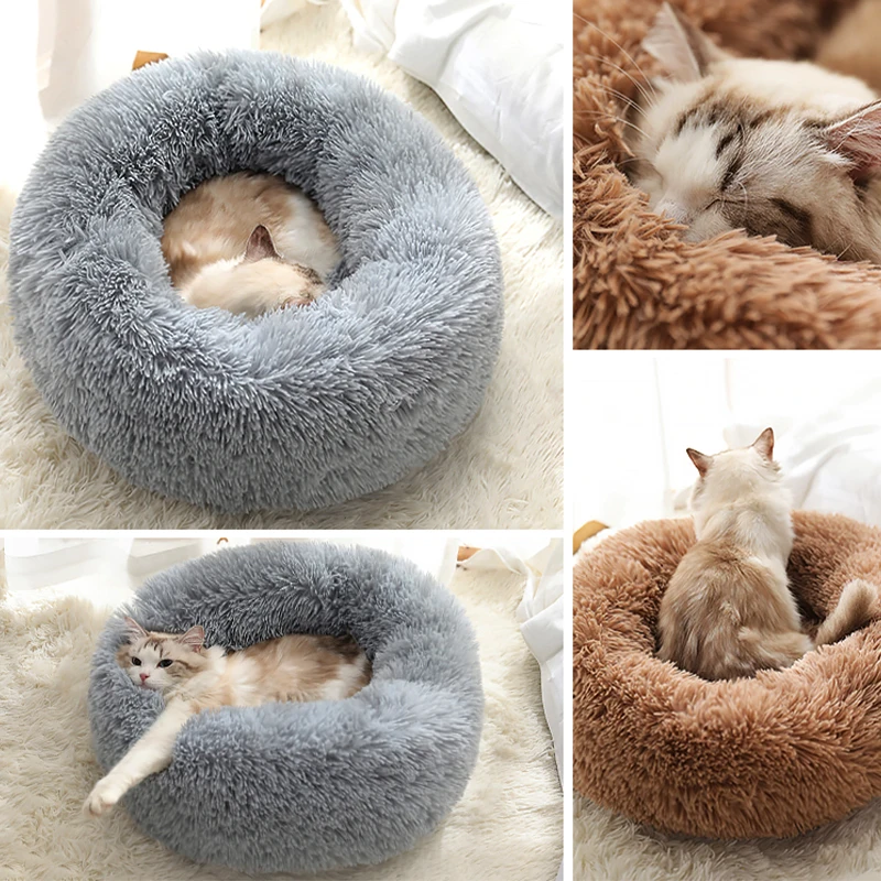 Pets Love To Sleep In It. Easy To Clean And Wash.Soft and Safe: The pet beds are made of cotton, a synthetic solid material explicitly designed to be safe for animals and humans. This donut pet bed also can keep your pet self-warming and comfortable in cold weather.Better Sleep: Our high-quality fluffy bed is ideal for pets who enjoy curling up! The raised rim can bring a sense of security and provide head and neck support, relieving your pet's anxiety, easing the transition to a new environment. Round pet beds provide more comfortable deep sleep and let pets feel more secure and surrounded by their love.Reduce Pet Anxiety: Like any curling position, providing head and neck support, the soft texture allows both dogs and cats to relieve any anxiety, also allowing you to feel less anxious and keep your best friend feeling comfy and quiet.Convenient: The non-slip pet donut bed is surrounded by soft fabric, fluffy and soft to the touch. Putting in your carpet, couches, sofas, chairs, beds, floors, and cars are convenient.