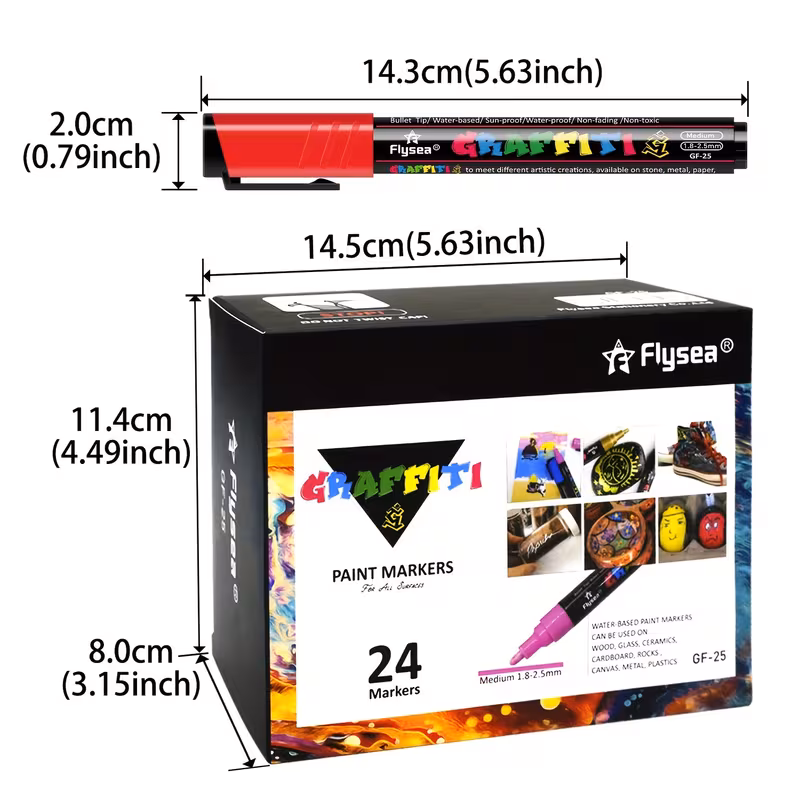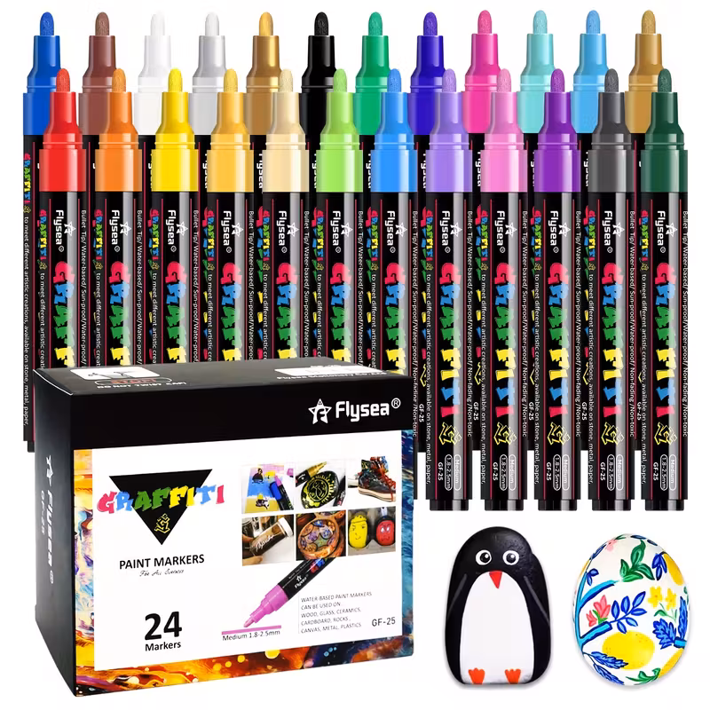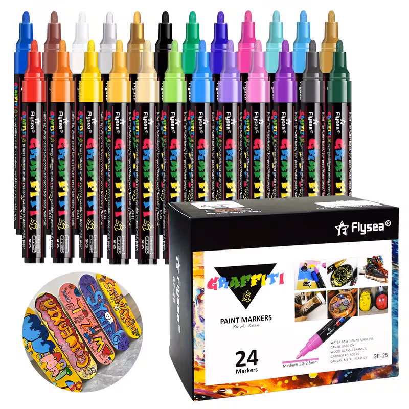 The FLYSEA 24pcs Medium Tip Acrylic Paint Marker Set offers versatility, durability, and vibrant color for Kiwi artists and DIY enthusiasts. With waterproof acrylic ink, smooth strokes, and multi-surface compatibility, this set ensures your artwork stays bright, bold, and long-lasting on skateboards, canvas, wood, stone, and beyond.