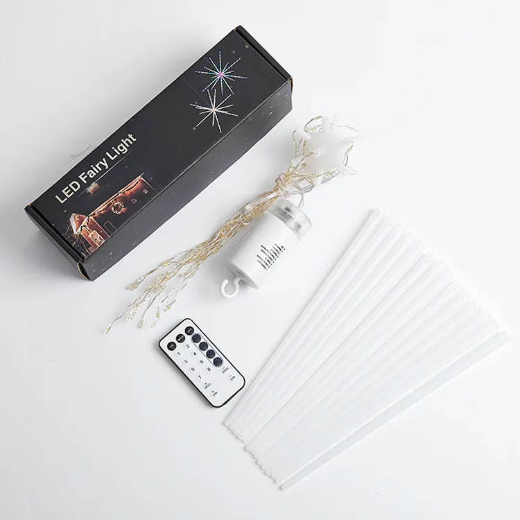 Ya sea que organice una cena al aire libre, celebre una ocasión especial o simplemente disfrute de una tarde relajante en su jardín, la luz Meteor Fireworks agrega un toque de glamour y emoción a cualquier ambiente. Es perfecto para colocar en patios, a lo largo de senderos o incluso colgado de árboles para un efecto de luz flotante. 1. 8 modos de iluminación con control remoto: hay 8 modos de visualización para ramos en forma de fuegos artificiales: (combinación/fila superior/adelante/atrás/atrás/estrella fugaz parpadeante/lento/fijo). A través del control remoto, puede configurar su propio modo. Debería ser fácil de cambiar, y el alcance de recepción efectivo es de aproximadamente 15 metros. 2. Luz de plástico para fuegos artificiales: la luz de hadas de estrella blanca cálida tiene 14 tubos de plástico. Hay 112 luces LED en su interior. Es una lámpara de araña práctica y duradera. Se puede convertir en un tubo según sus preferencias, pero no lo doble demasiado.