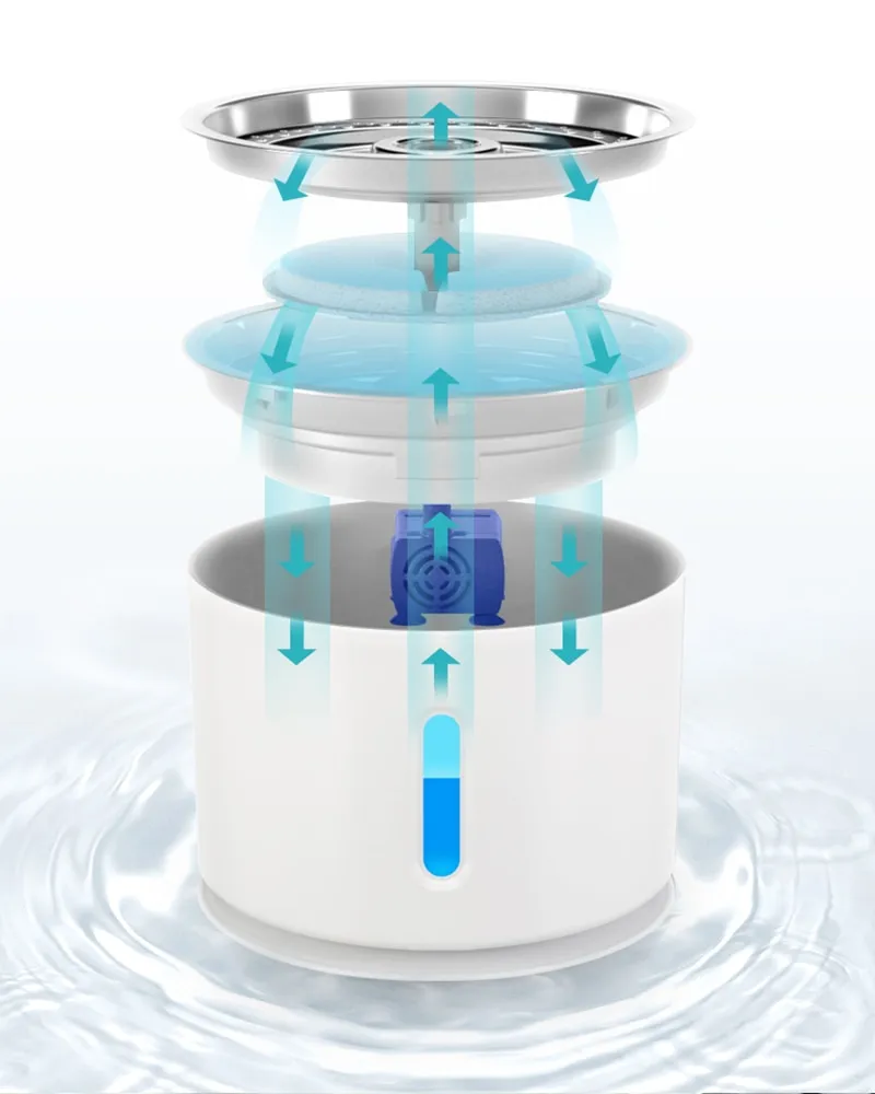 3. Sistema de filtración por circulación: El sistema de filtración por circulación utiliza un filtro circular reemplazable para purificar el agua y eliminar pelos, suciedad y restos de comida. El filtro circular está hecho de varias capas de algodón, carbón activado de coco y resina de intercambio iónico. Proporciona agua fresca y limpia para tus adorables mascotas.