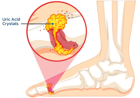 La gota (artritis metabólica) es causada por un aumento en la biosíntesis de ácido úrico, una producción excesiva de ácido úrico o una excreción deficiente de este. Esto resulta en un aumento del ácido úrico en la sangre y, por lo tanto, causa gota, que se caracteriza por hiperuricemia y episodios recurrentes de artritis gotosa aguda, que se presenta comúnmente en las articulaciones del dedo gordo del pie, pero también en las manos, rodillas y codos. etc..