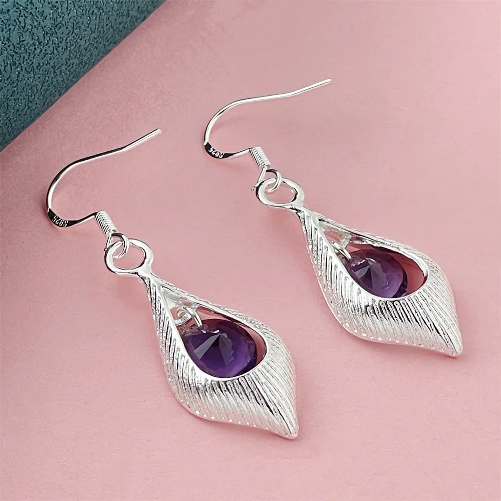 Gem Color: Fuchsia - 925 Silver Heart Shape Earrings Women Exquisite Student Jewelry Accessories
