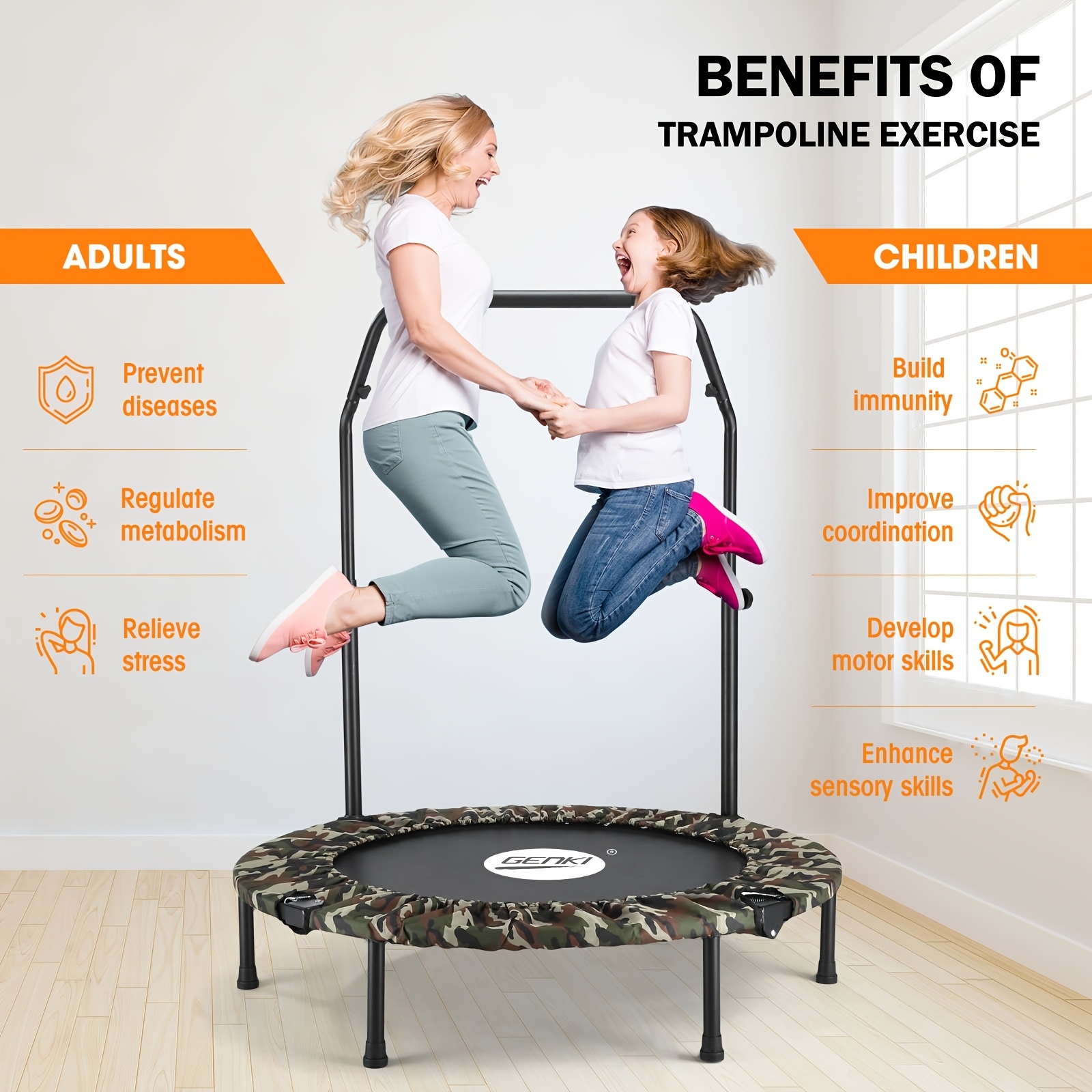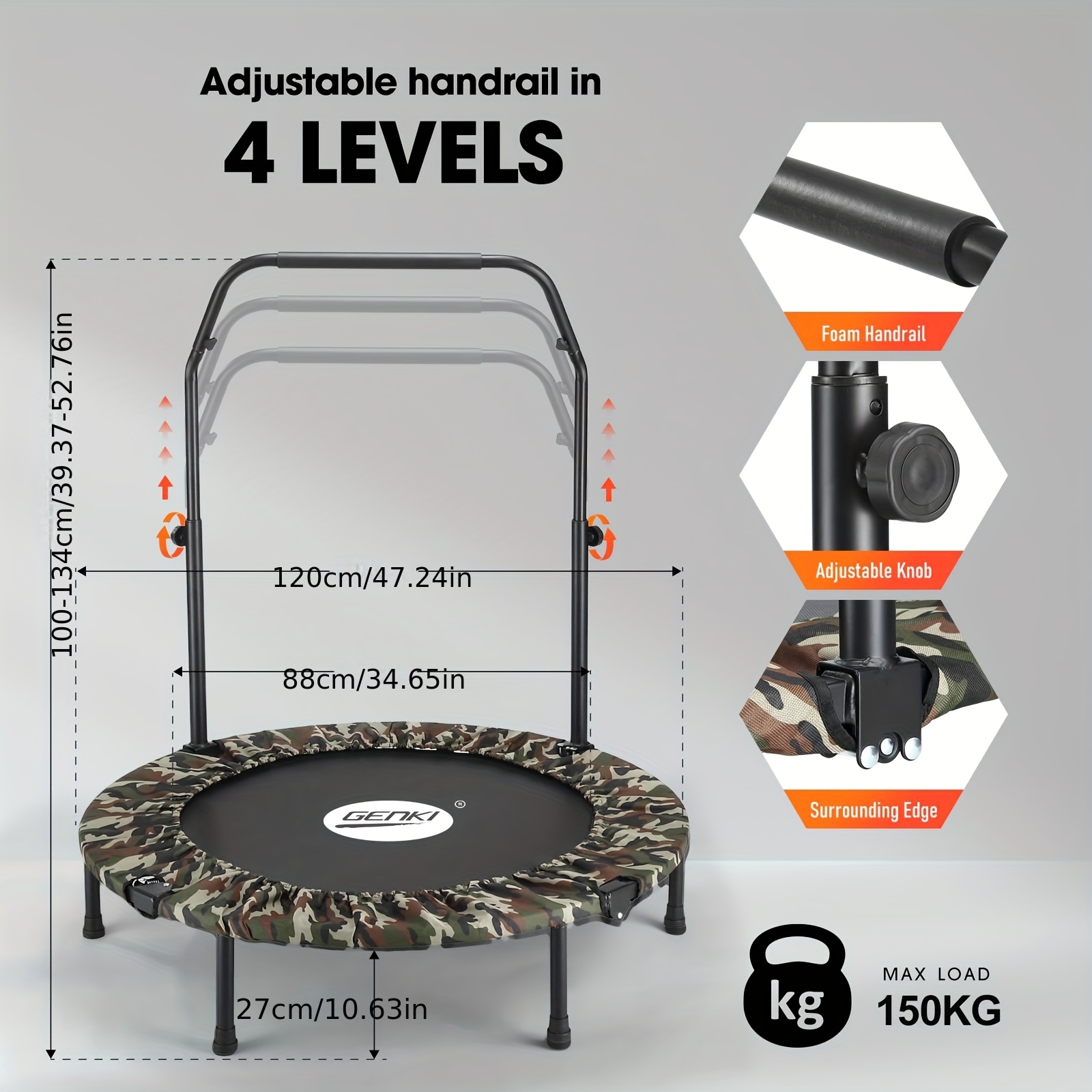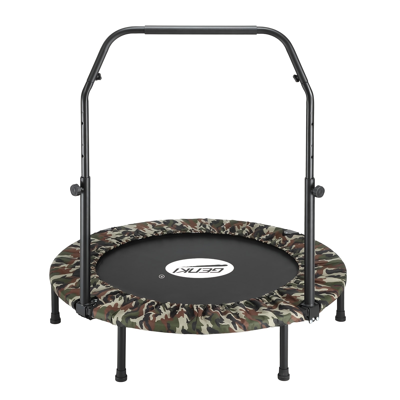 This Genki trampoline not only works out your entire body, but it also aids in muscle strengthening and enhances your overall health. Made with reinforced closed coil springs, it offers a safe and controlled bouncing experience to prevent injuries. Additionally, it features robust stainless steel legs with non-slip rubber caps for added stability and safety.Moreover, the perimeter of the Oxford is broadened to fill in all the spaces between the mat and the metal frame, ensuring safety and reducing the risk of accidental slips. Additionally, the robust and long-lasting PP jumping mat is designed to endure frequent use, whether for vigorous exercise or lively playtime. Even better, an adjustable handrail offers four different height settings to accommodate users of various ages and fitness abilities.