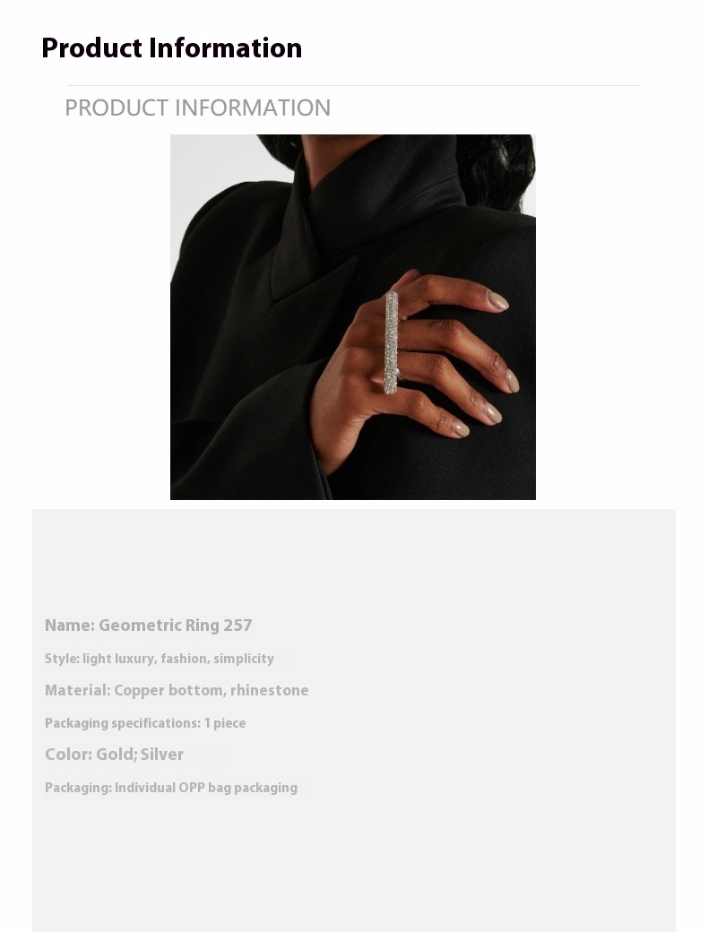 The ring’s double-layered geometric structure offers a modern aesthetic, creating a sleek and contemporary look that complements various styles. Its minimalist lines and rhinestone accents make it a versatile piece for any wardrobe.
