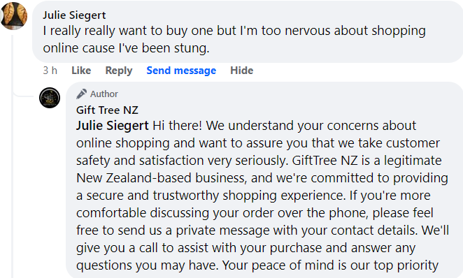 Dile adiós a esos anuncios molestos e insistentes. En su lugar, deja tus datos y podrías recibir una llamada personal de nuestro propietario. ¿Por qué? Porque en Gifttree NZ, cada cliente importa. ¡De verdad nos importa!